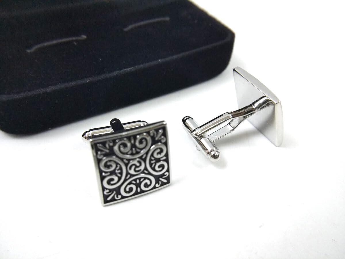 [F NODE] シルバー ブラック スクエア カフスボタン カフリンクス アラベスク柄 エンボス加工 真鍮 ロジウムコーティング メンズ 男性用 おしゃれ カフス ジュエリー アクセサリー ビジネス カジュアル パーティー 結婚式 二次会 フォーマル フォーマルシーンにも使える上品なデザイン