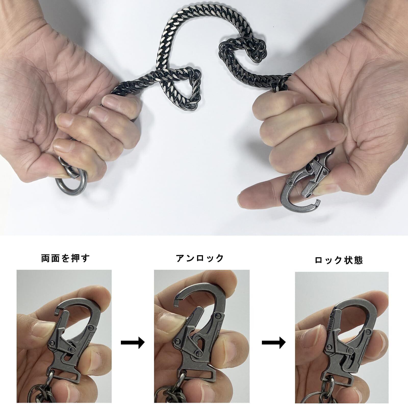 【二重ロック設計で安心安全】 このウォレットチェーンはダブルロック機構を採用し、二重ロックのカラビナを搭載しています。誤った開錠や盗難を防ぐために設計されており、開錠手順は画像をご確認ください。大切なものをしっかり守ります