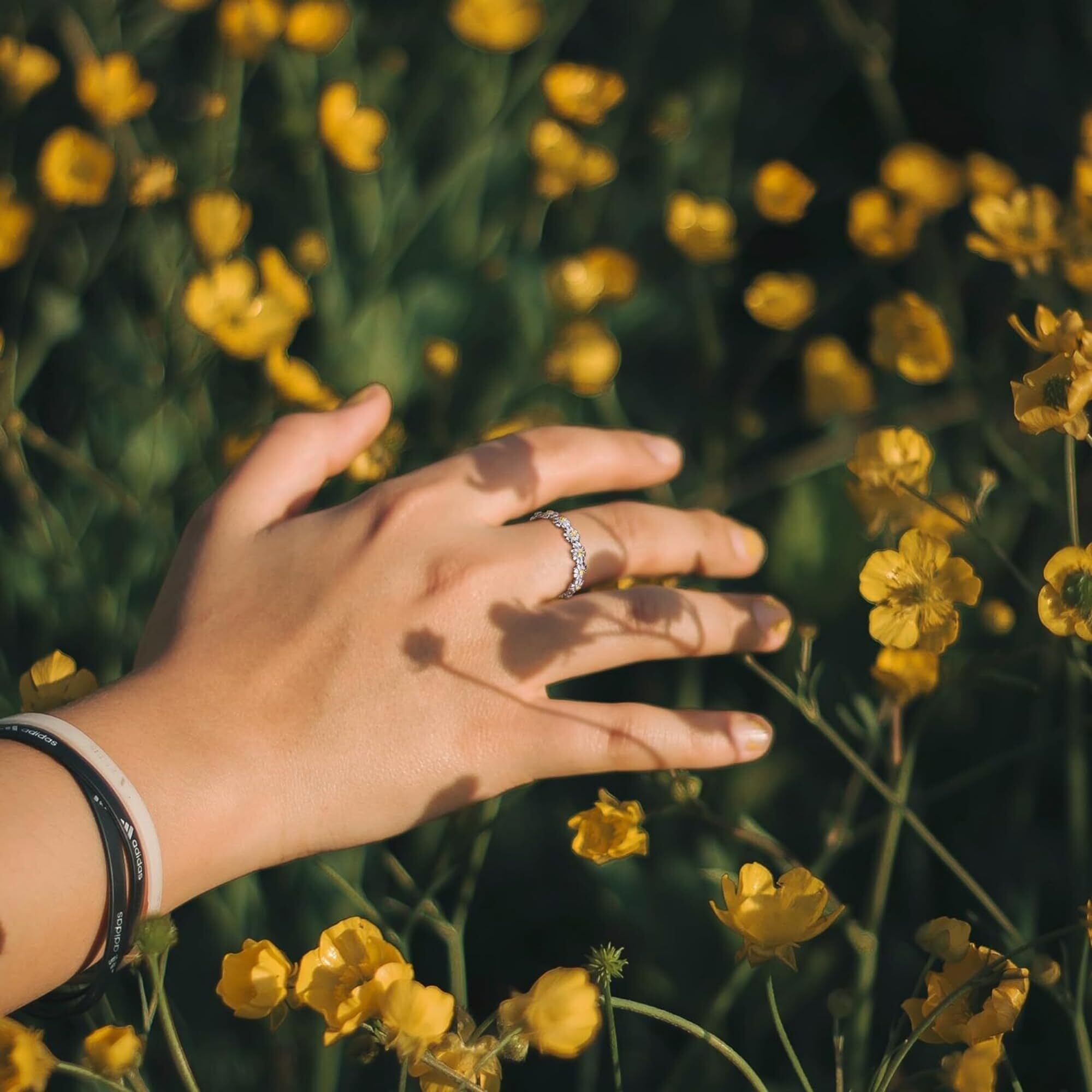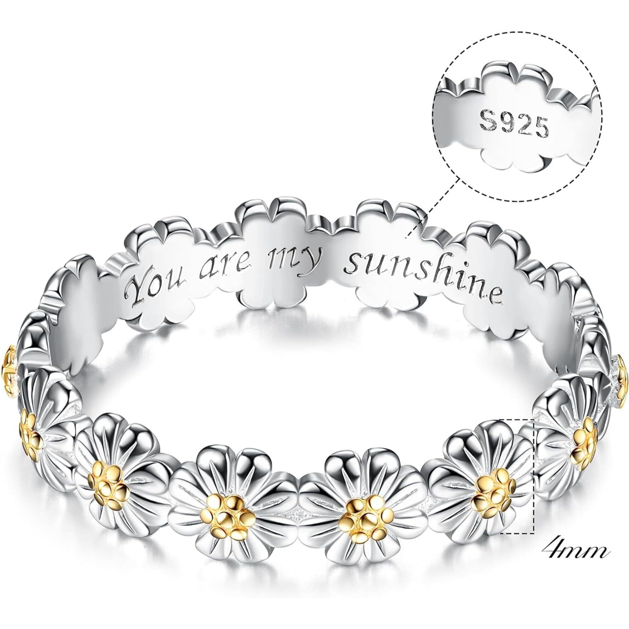 あなたは私の太陽です デイジー リング この魅惑的なスターリング シルバー デイジー リングで、デイジーの魅惑的な象徴性を取り入れてください。バンドを飾るそれぞれの繊細なデイジーは、純粋さ、無邪気さ、新しい始まりを表し、喜びと楽観主義の感覚を呼び起こします。