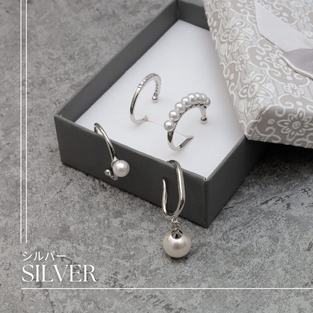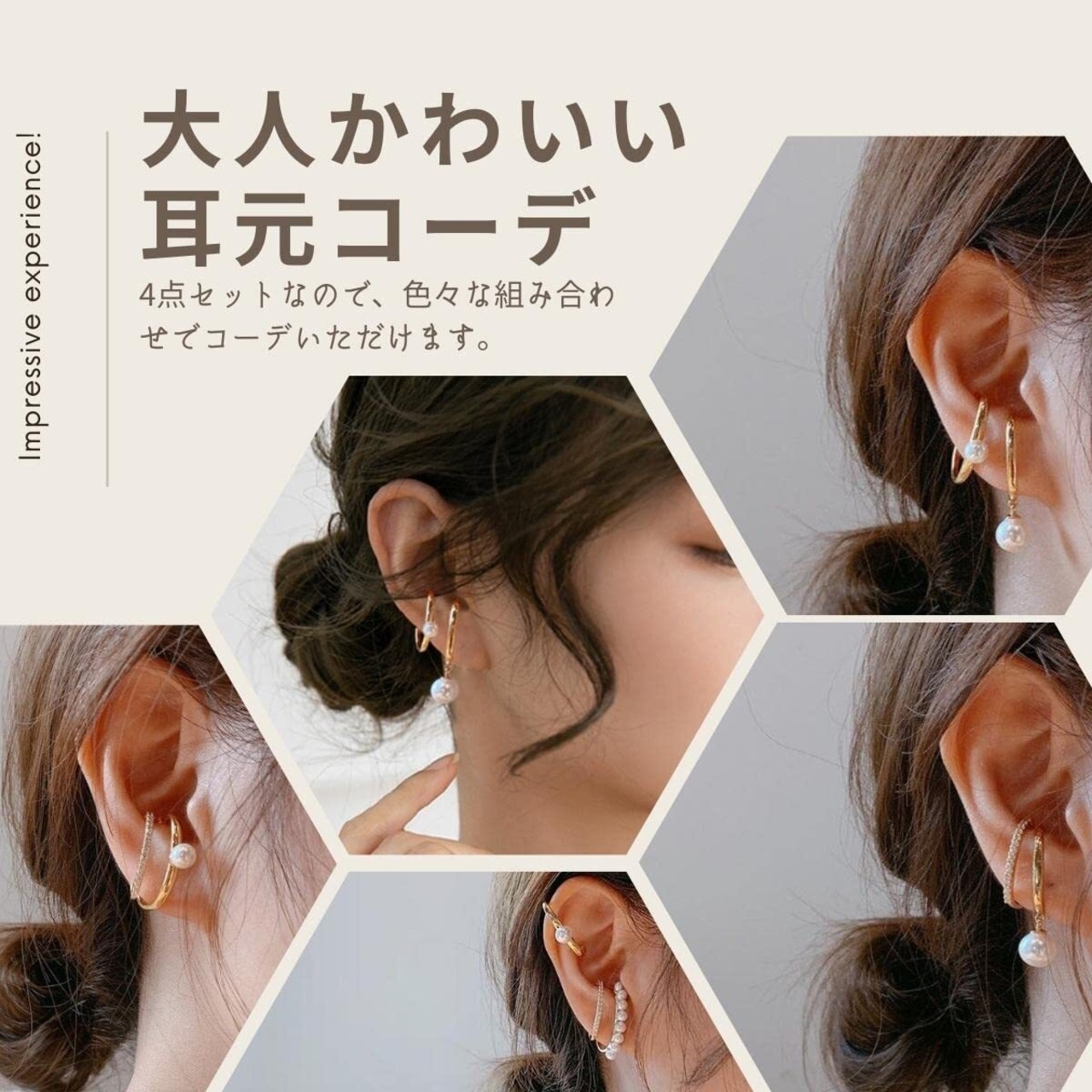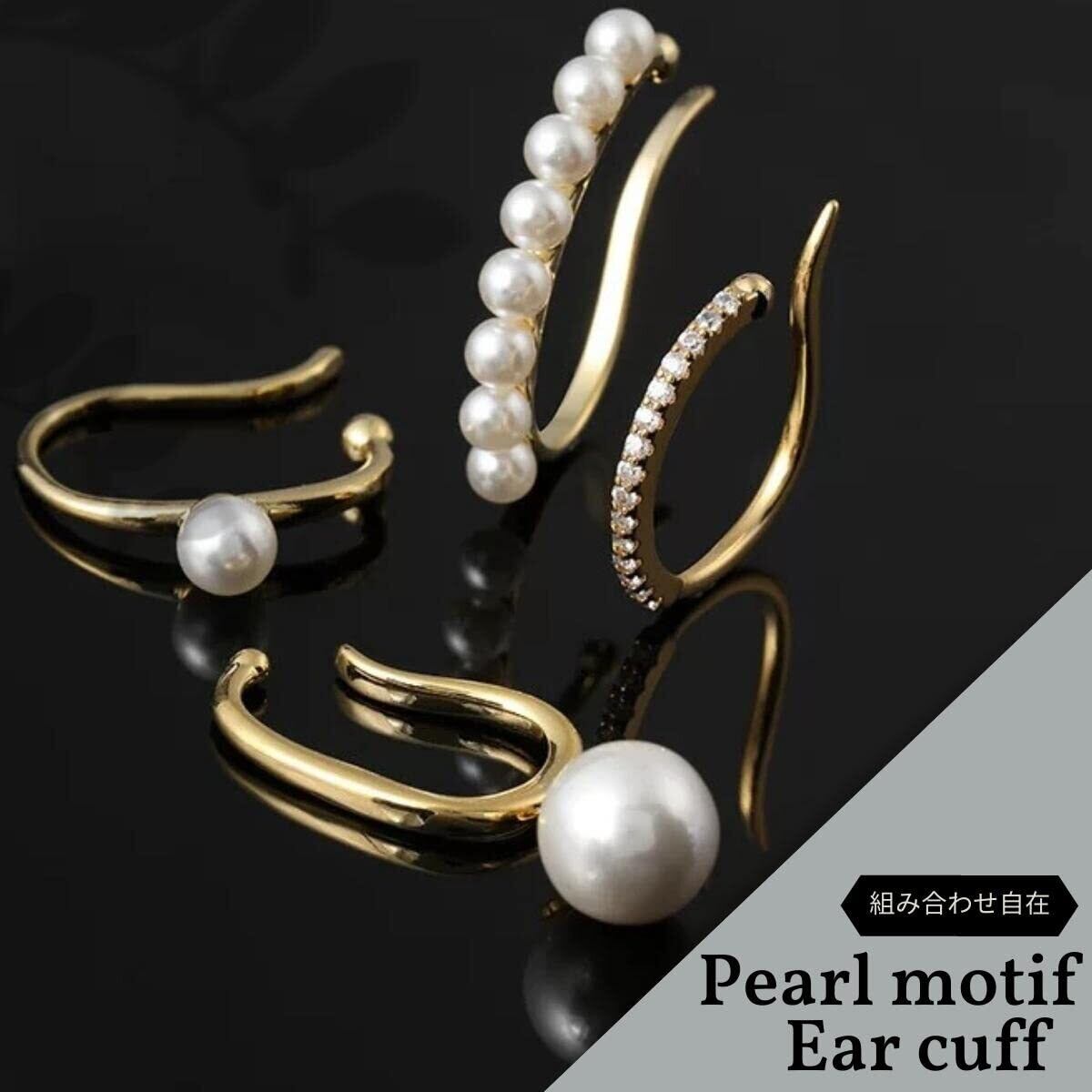 パール モチーフが特徴のイヤーカフ。 4点セットなので重ね付けや両耳に付けたりなど、お好みに合わせて自由なアレンジをお楽しみいただけます。