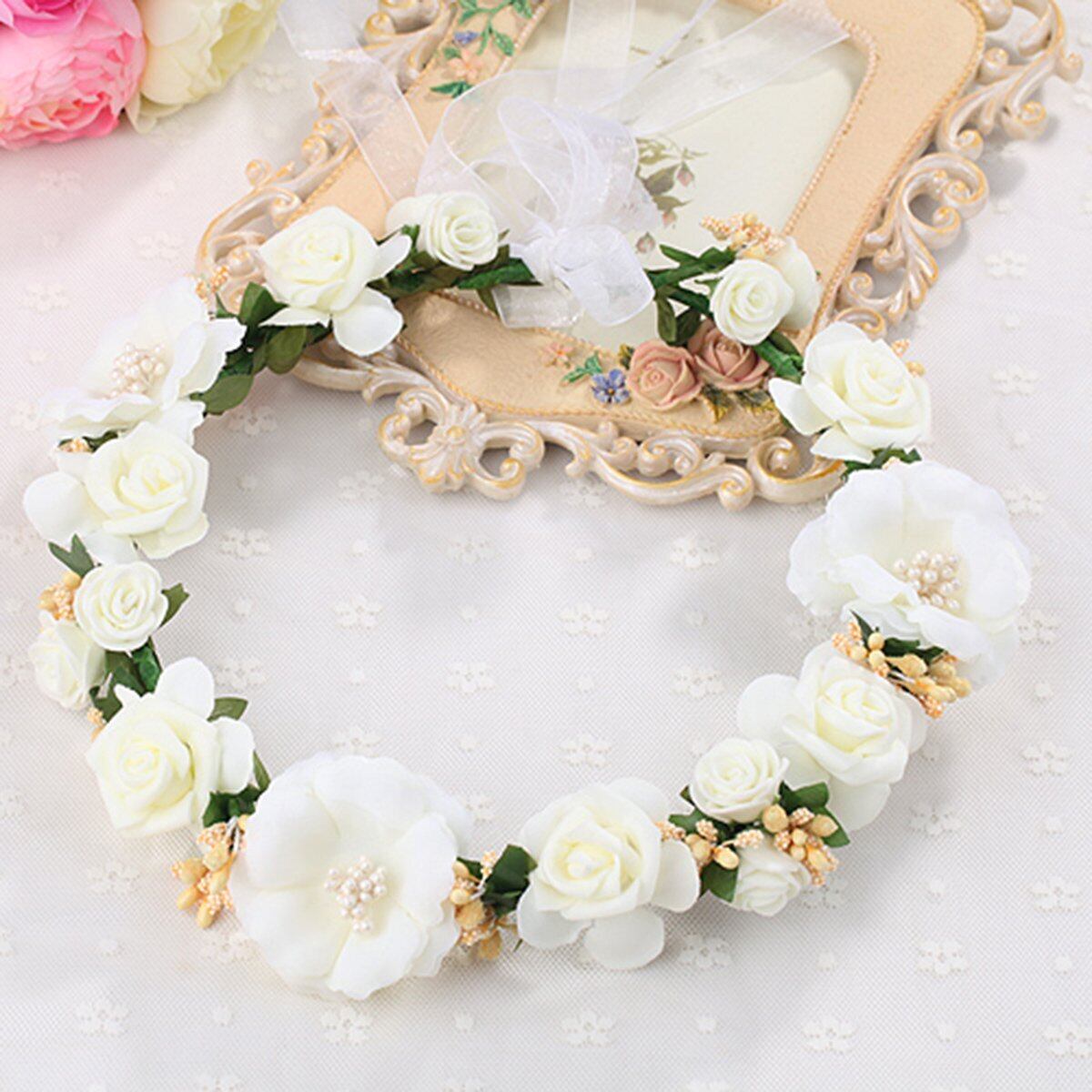 ハロウィン 花冠 花かんむり お花の 冠 花冠 ヘッドドレス 髪飾り ヘアアクセサリー ウェディング ダンス衣装 ロマンチック お花の冠 腕輪 パーティー 結婚式 写真撮影 2次会 発表会 演奏会 コンサート (ホワイト01)