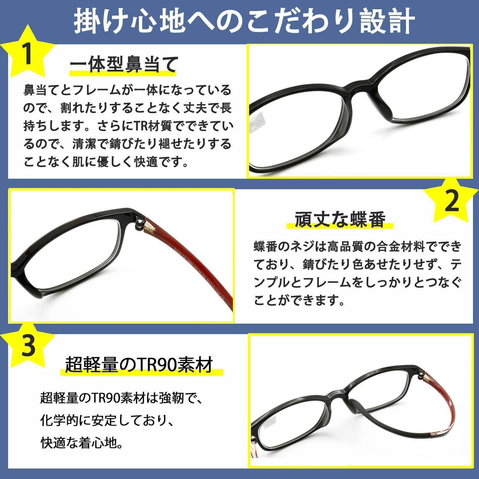 【防ブルーライトの超清樹脂レンズ】当製品のレンズは、最先端の防ブルーライト技術を搭載した超清樹脂製です。現代社会に欠かせないスマートフォンやパソコンなどの電子デバイスから発する有害ブルーライトを有効に遮断し、視界を保護します。長時間のデジタルデバイス使用後の眼疲労や目の乾燥感を軽減し、より健康な視覚体験を提供します。