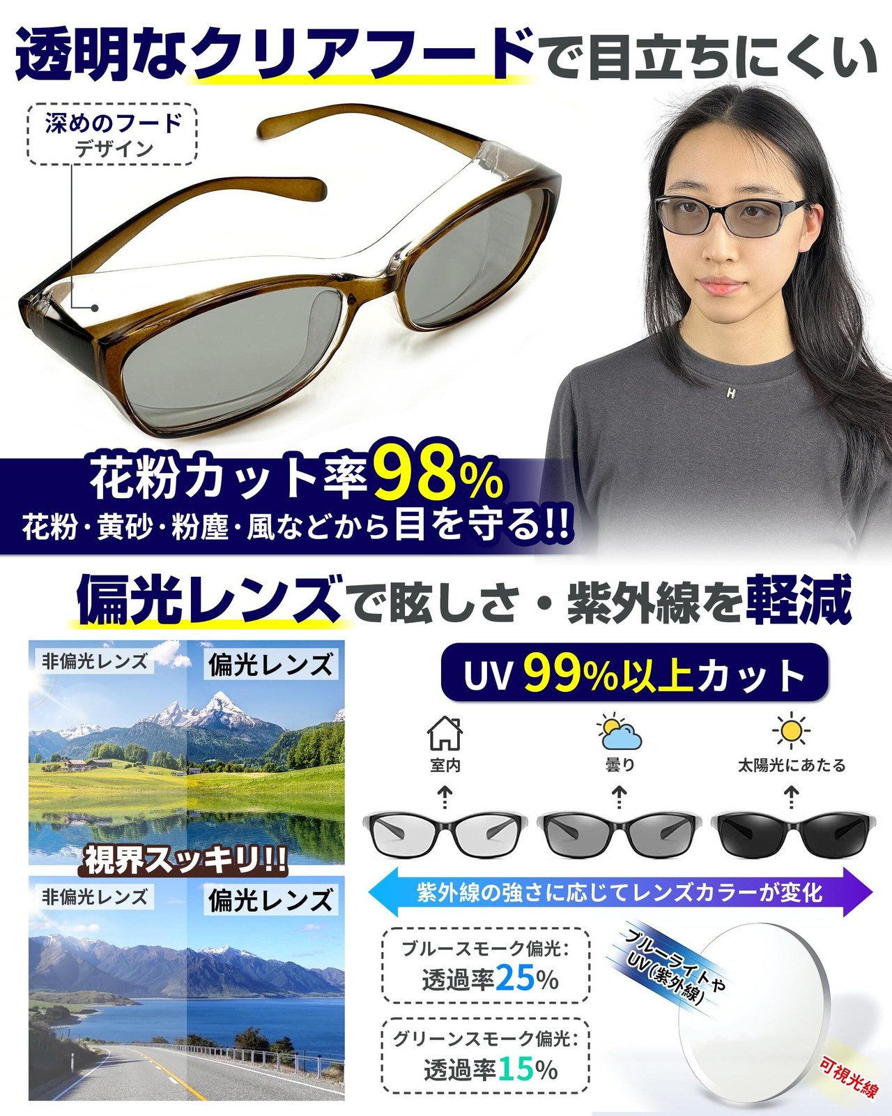 【業界初!これ一本で花粉も紫外線も徹底ガード】花粉・黄砂対策に便利な保護メガネ機能と、眩しさや紫外線を軽減する偏光サングラス機能を一体化した多機能メガネが登場!透明フードで目立ちにくく、超弾性樹脂TR90製の軽量テンプルが快適な着け心地を実現。さらに偏光レンズで光のギラつきや乱反射をカットし、有害な紫外線を99%以上カット。日常からアウトドアまで、幅広いシーンで活躍するスタイリッシュな一品です。