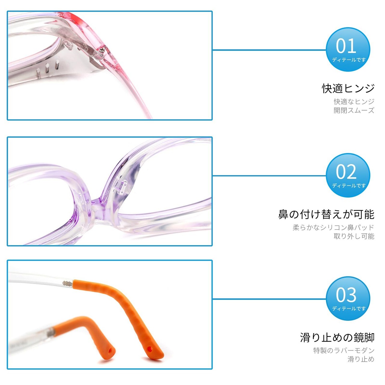 【軽量&やわらかTR90素材】超軽量:わずか26.6g!超軽量で耐久性に優れた形状記憶TR90素材を使用。変形しにくく、柔軟性があり、お子様の顔にしっかりフィットします。圧迫感が少なく、快適な装着感を実現。 一体型ノーズパッドが日本人の顔にフィットしやすい設計。柔らかなシリコン製のフードは、長い時間装着してもより快適に。