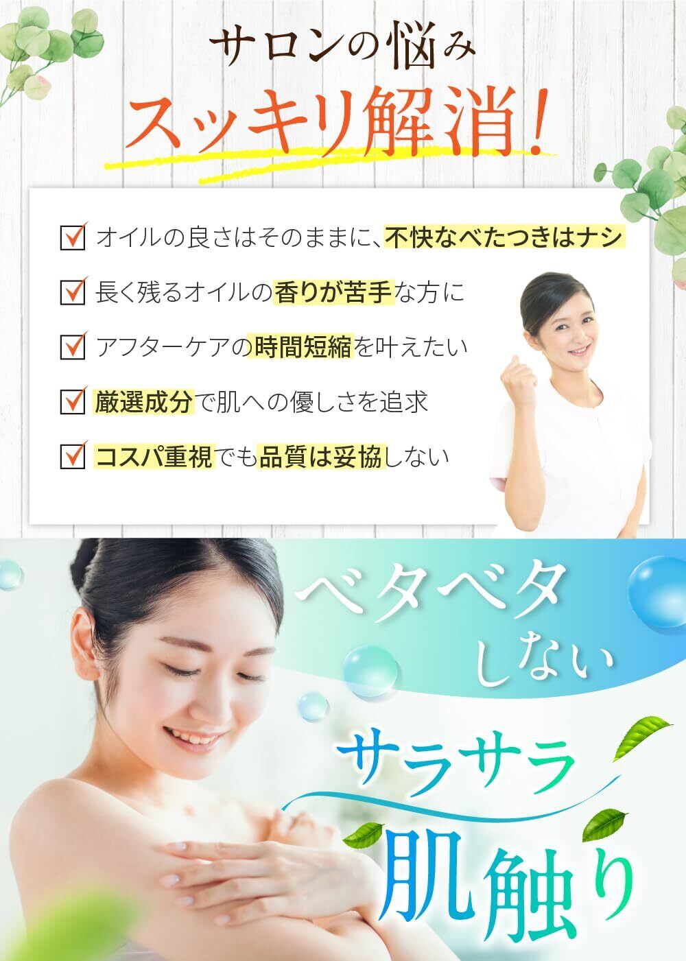 ●適量を手に取り、全身に薄くのばします。マッサージ後は、清潔なホットタオル等で拭き取るか洗い流して下さい。 ※こちらの商品はノンオイル仕様となっております。 エッセンシャルオイル等をブレンドして頂いても問題ございませんが、オイルの特徴等が変化する場合がございます。