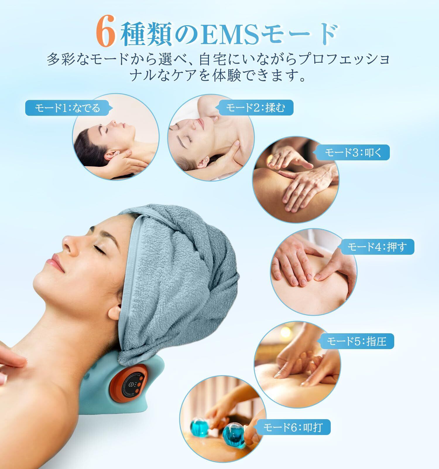 「全新技術で筋肉を活性化」全新のEMS微電流技術を採用しており、微弱な電流で首元に心地よい刺激を与えます。この技術は、筋肉に対して優しく働きかけ、リラックス効果を高めることができます。使用することで、首周りの疲れを軽減し、リフレッシュ感を得ることができます。また、EMSの強度は6段階調整可能で、好みに合わせて最適な刺激を選べます。