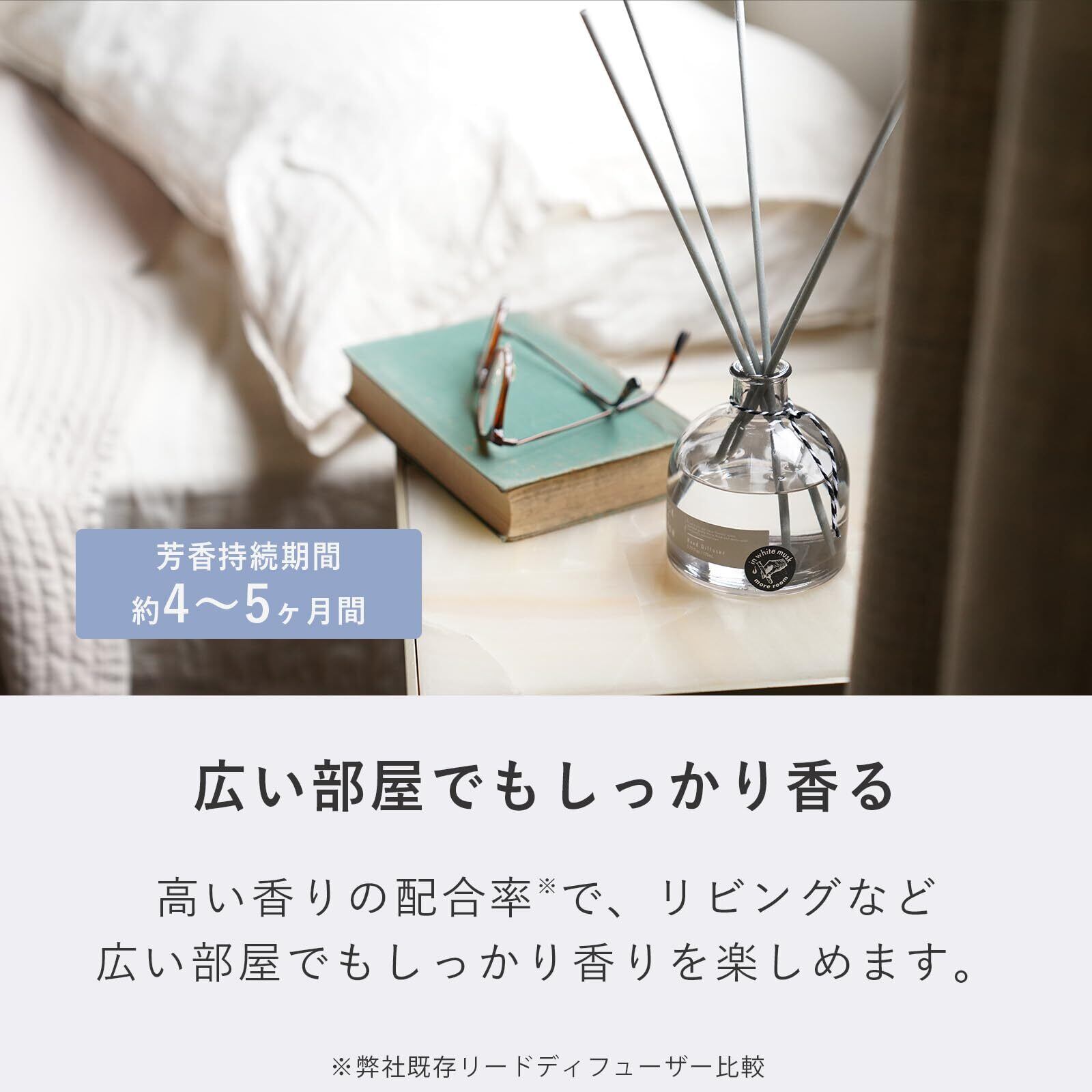 高い香りの配合率で、リビングなど広い部屋でもしっかり香りを楽しめます(既存リードディフューザー比較)。芳香持続時間は約4~5ヶ月