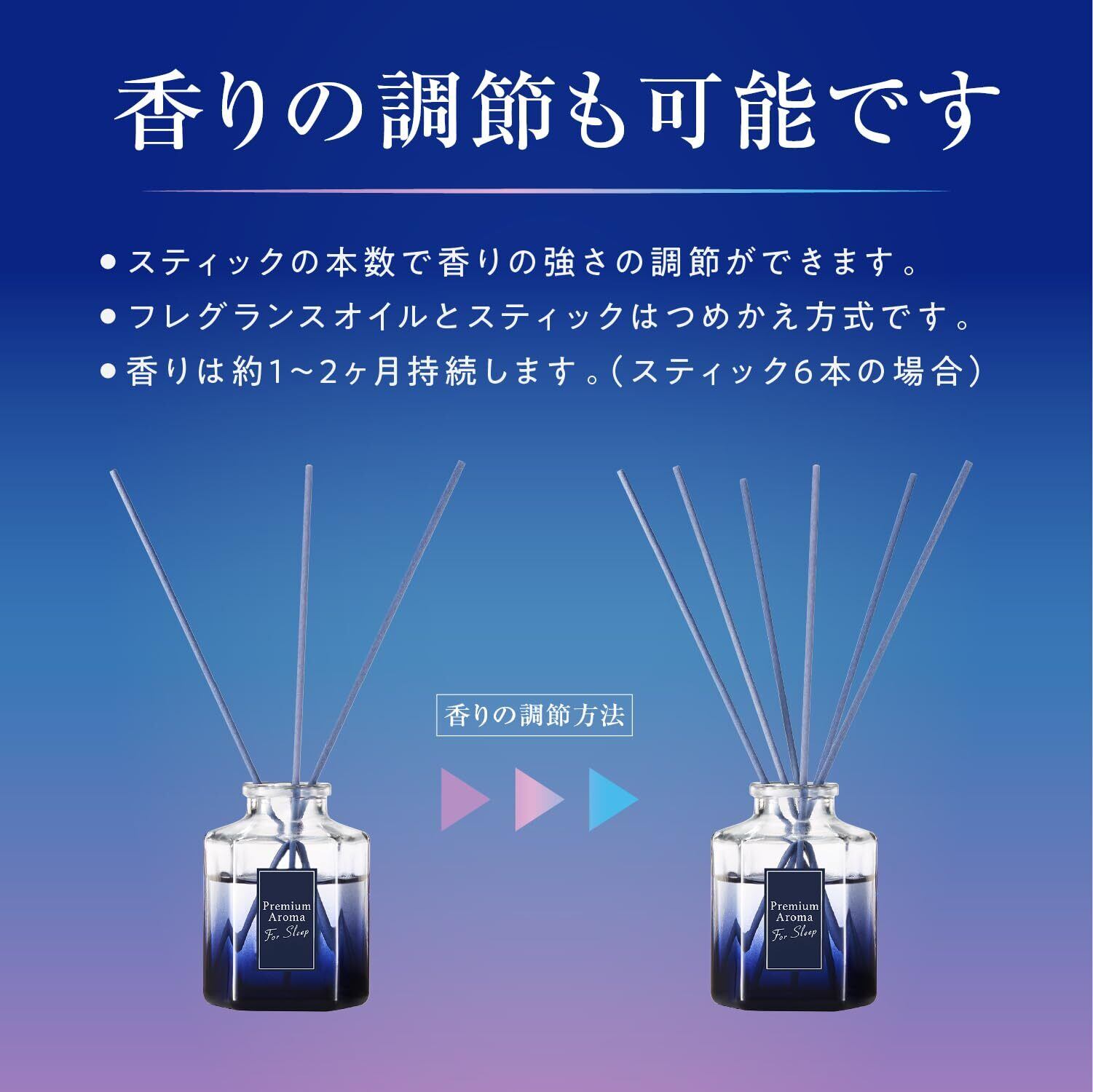 スティックの本数で香りの強さの調節が出来ます。通常約1~2ヵ月持続します(スティック6本の場合)。
