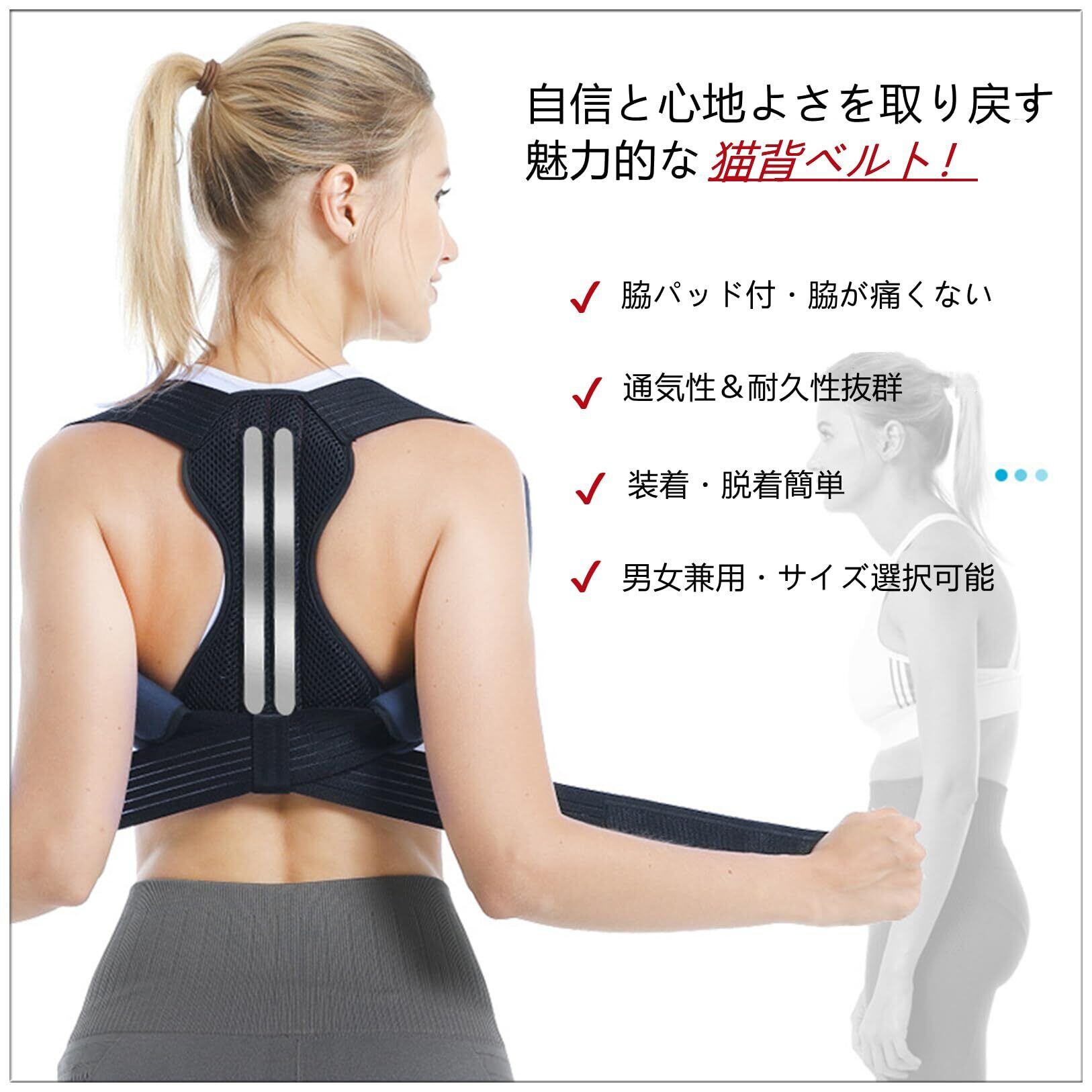 【脇が痛くない・脇パッド付】「バンドが脇に食い込む…」「脇が痛い…」といった従来品の欠点を改良。本製品は弾力のあるバンドを使用し、優れた伸縮性を持っています。また、脇下の食い込みが気になる方のために専用の脇パッドを付属しました。長時間装着してもストレスを感じることを最小限に抑えます。仕事をしながら1日2時間程度の着用をするだけ。初めは10~20分から始め、慣れてきたら1日2時間を目安に着用する習慣をつけていきましょう。