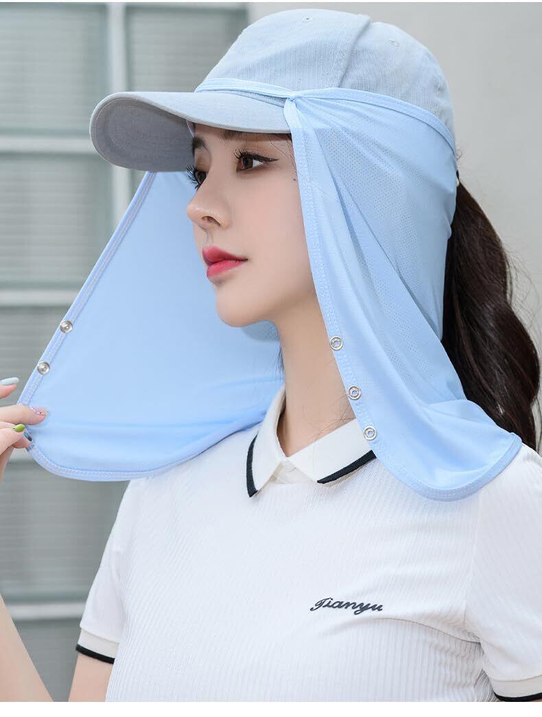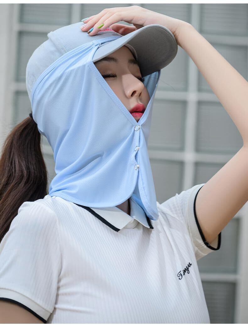 【帽子に装着】一般的なフェイスカバーとは異なり、帽子の上から被るタイプのサンシェードです。肌に密着しないので、肌荒れしにくく暑苦しさを感じません。