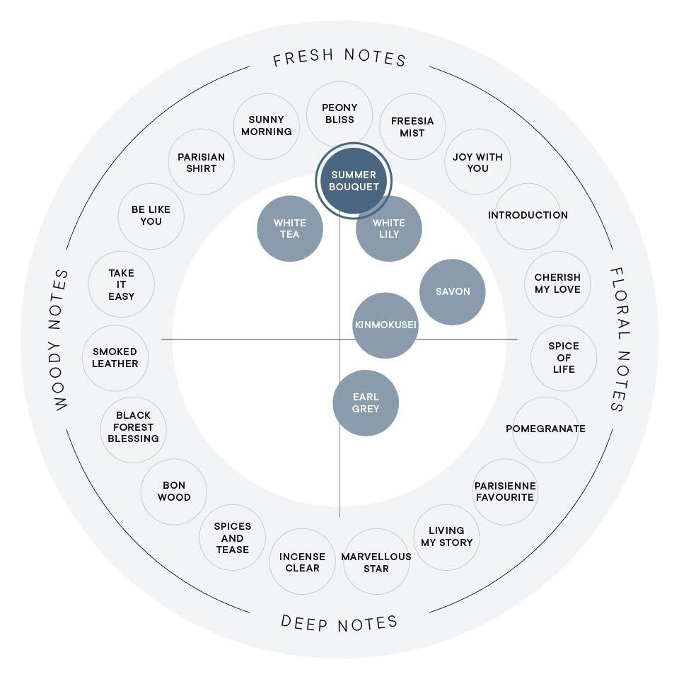 【SUMMER BOUQUET】SHIRO FRAGRANCEの「サボン」よりもフレッシュで、「ホワイトティー」よりもフローラルに香ります。心ときめくような華やかさがあるので、「ホワイトリリー」がお好きな方にもおすすめです。 また、SHIRO PERFUMEの「PEONY BLISS」や「FREESIA MIST」をまとったときのような、可愛らしくも上品な印象を与えてくれます。