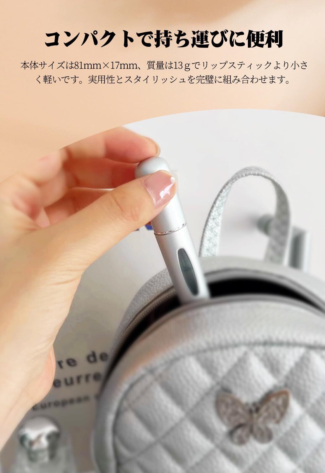 【リップスティックサイズで持ち運びに便利】本体のサイズは8.1cm*1.7cmで、ほとんどリップスティックと同じサイズです。出かける時はカバンや服の袋に入れることはもちろん、飛行機で持ち込みにも活躍します。