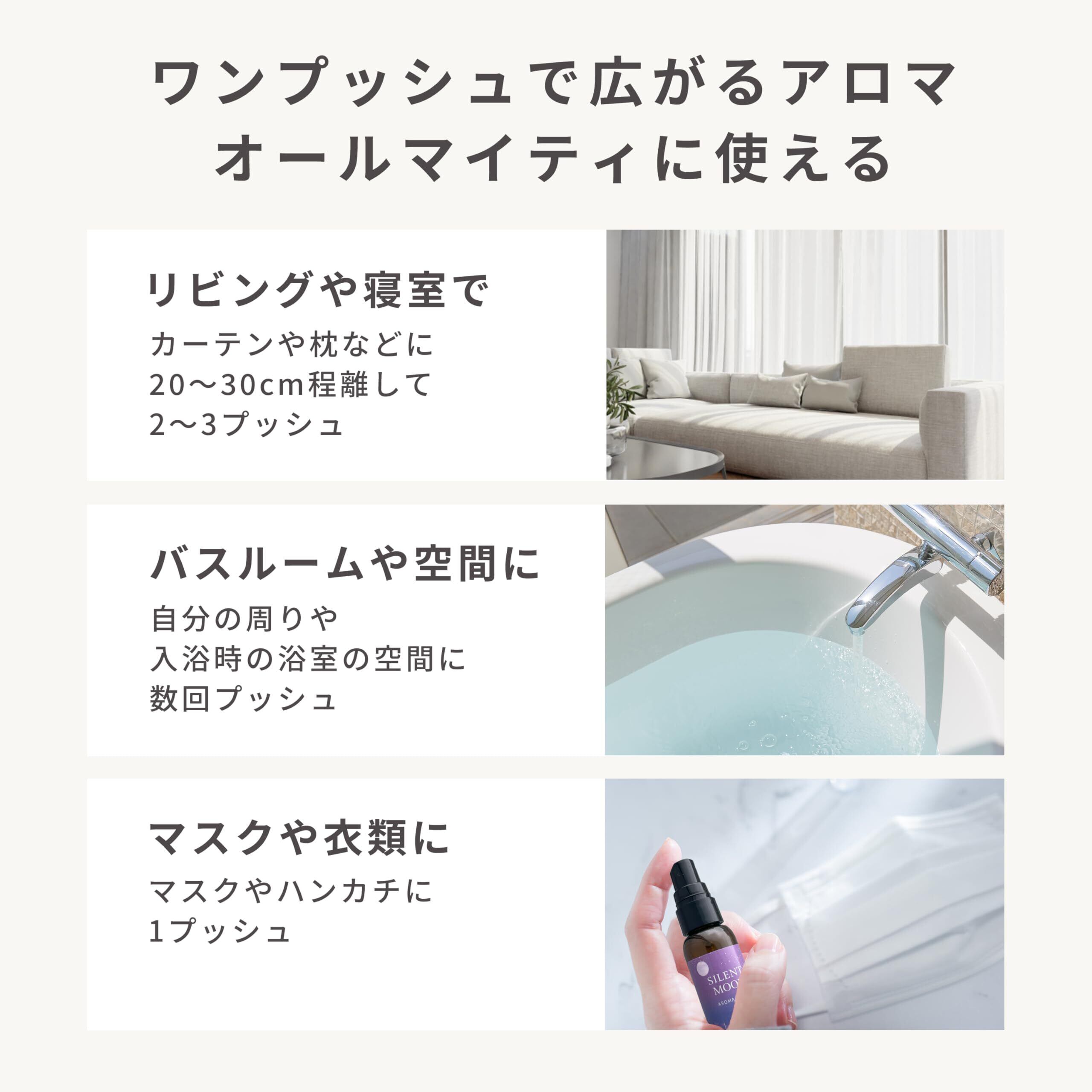 【ご使用方法】ご使用の際にはよく振ってからお使いください。 ○枕やシーツ、カーテン、ファブリック、タオルなどに20~30cm程度離して2~3回プッシュすると柔らかな香りが広がります。 ○首や手首などに1プッシュして香水代わりにお使いいただけます。 ○自分の周りなど、空気中に数回プッシュして芳香浴としてもご利用いただけます。