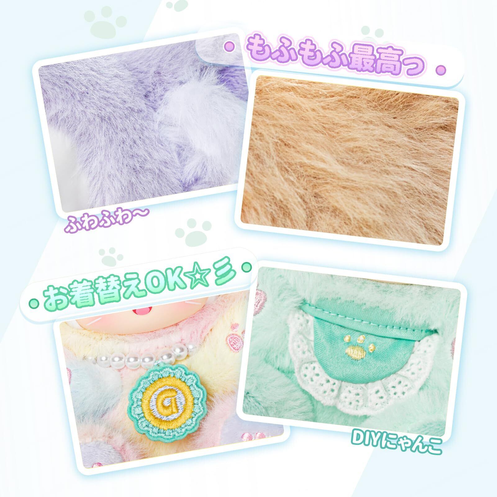 【癒し系のふんわり触感&着せ替え可能】触れるたびに癒されるもこもこ質感。一部アクセサリーは取り外し&着せ替えができ、コーディネート遊びも楽しめます。