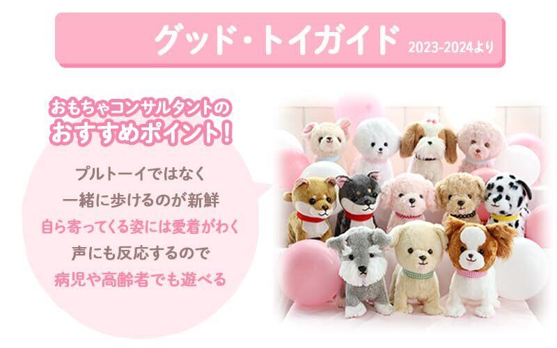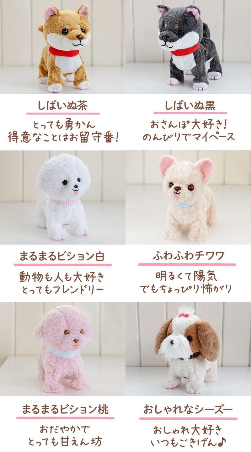 【遊び方】電池を入れてリードをつけて、おなか側のスイッチをONに。ハンドルをにぎるとトコトコ歩いてお散歩します。リードを外しても遊べます。大き目の声で呼びかけたり、あたまや体をなでるとワンワン鳴いたり甘え鳴きしたり、しっぽもふりふり。ランダムに反応します。動いて鳴く姿がとっても可愛いです。