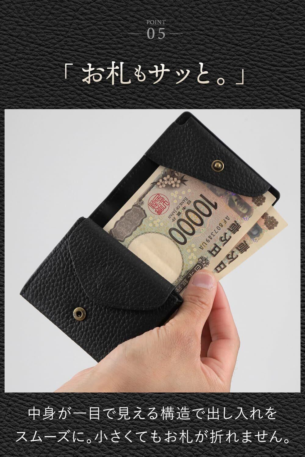 Detail05【お札もサッと。】中身が一目で見える構造で出し入れをスムーズに。小さくてもお札が折れません。Detail06【小銭が一目瞭然。】大きく開くので、小銭が探しやすく、ボタン付きでこぼれる心配もありません。Detail07【広がるマチ付きで快適。】カードの収納場所をあえて1か所にすることで、探す手間も軽減しました。Detail08【こだわりの牛本革】幾度も試案を重ね、耐久性と触り心地に優れた牛本革に辿り着きました。