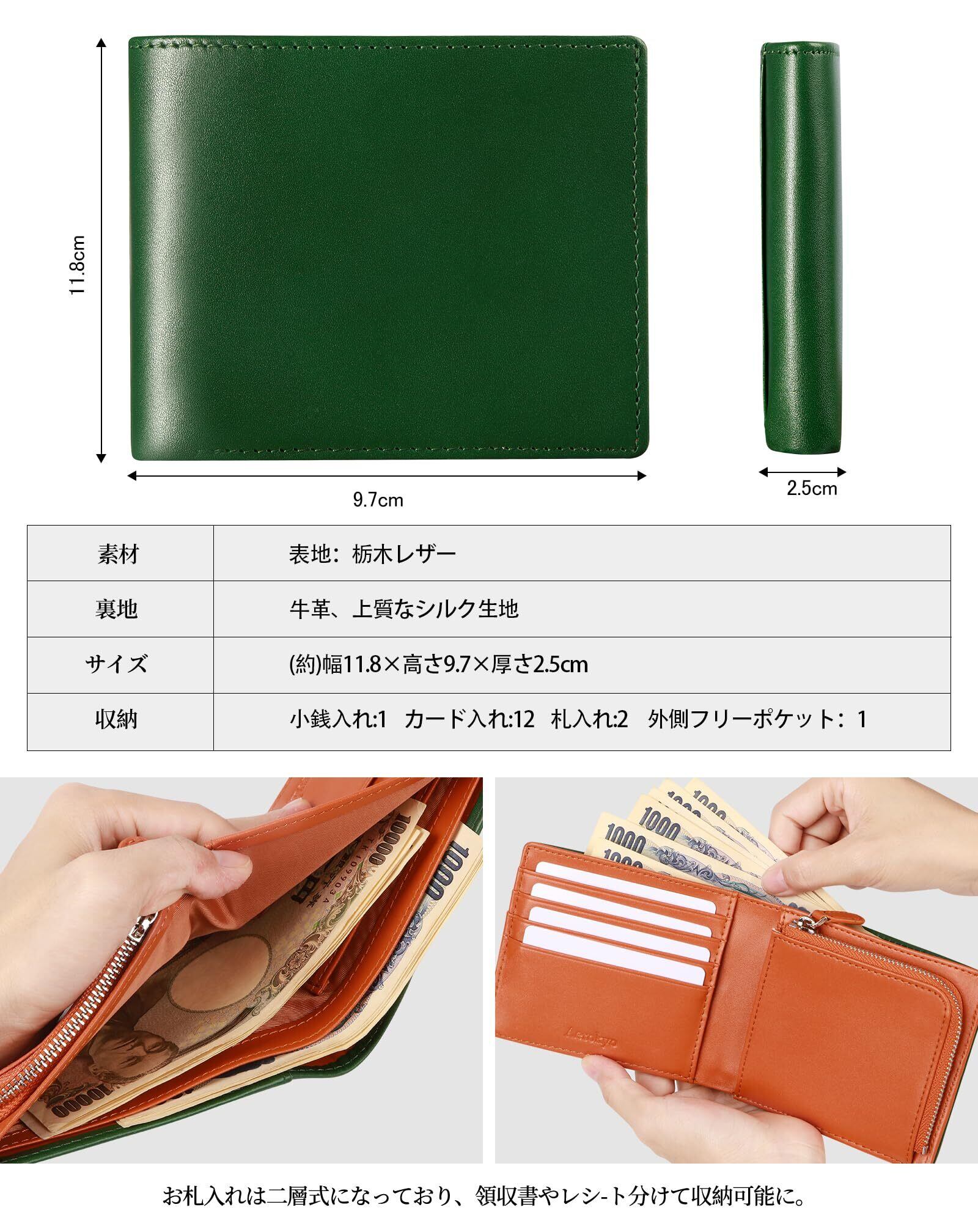 【商品仕様】:(素材 ):栃木 レザー;(カラー5色):ブラックx2、グリーン、ブラウン、コーヒー;(サイズ):たて11.8cm×よこ9.7cm×厚2.5cm;重さ:約100g(仕様):カード入れx12、札入れx2、外ポケットx1(ICカード対応)、L字型ファスナー小銭入れ× 1(コイン出し入れ簡単)。開いたときにパッと見渡せる。さらに、カードもお札も取り出しやすい構造になっています。