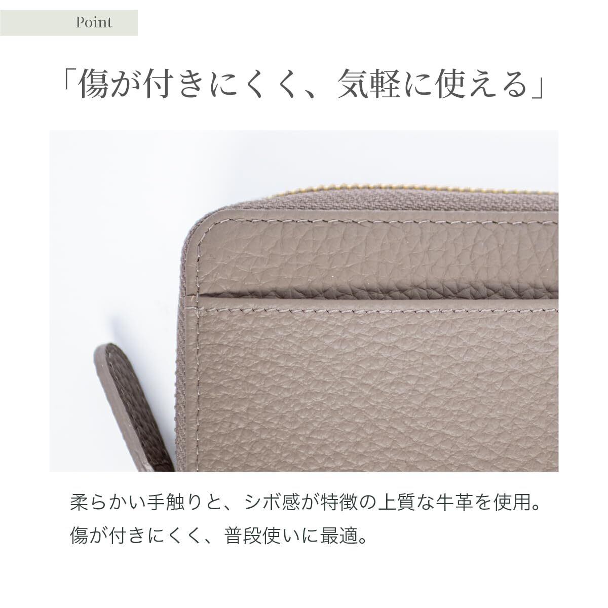 【高級感のある牛革製】シボ感の手触りが良い上質なレザーを使用しています。カード・小銭・お札を入れてもすっきり収まり、メイン財布にもサブウォレットとしても、幅広く使えるアイテムです。