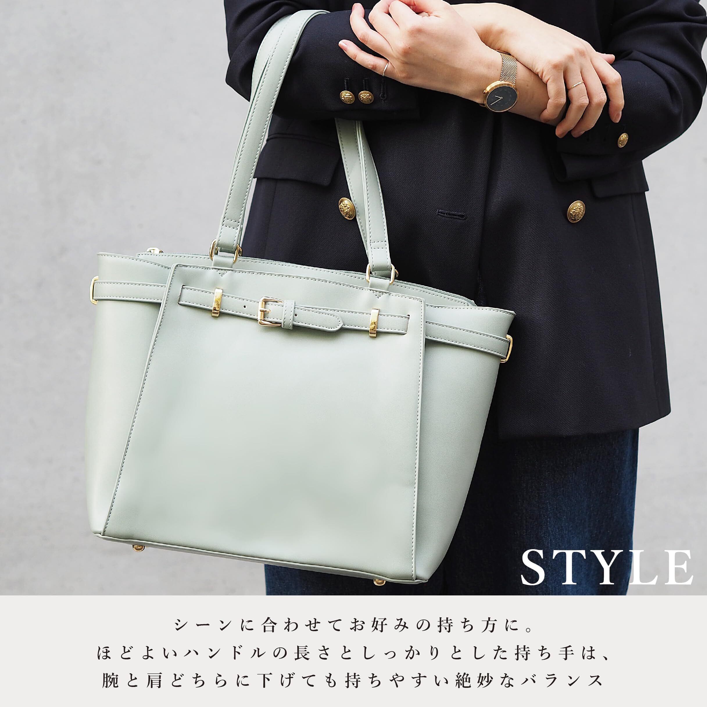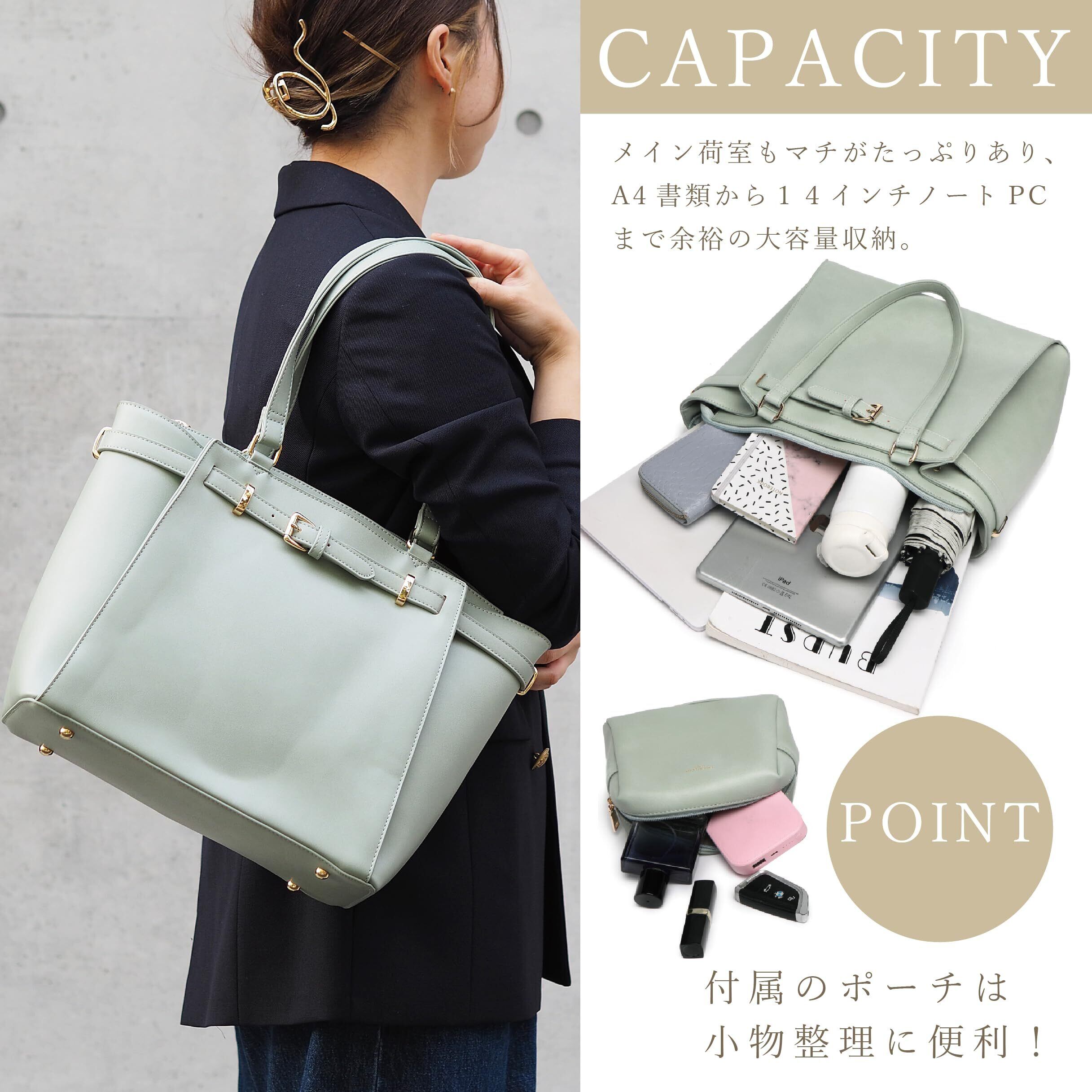 ①ベルトのデザインが上品な印象を添え、エレガンスな大人デザインに仕上がっています。 ② ビジネスとしても通勤通学用としても便利な仕様です。 ③あおりポケットは出し入れ便利ですぐに使う荷物を入れるにとっても便利です。 ④メイン荷室もマチがタップリありA4書類から14インチのノートPCまで余裕の収納力。 ⑤底鋲も付いていて床置きしても自立するのもとっても便利です! ⑥アイボリーやピンクベージュなら女性らしく、ブラックやキャメルのようなシックなカラーだとクールで都会的な印象に!!