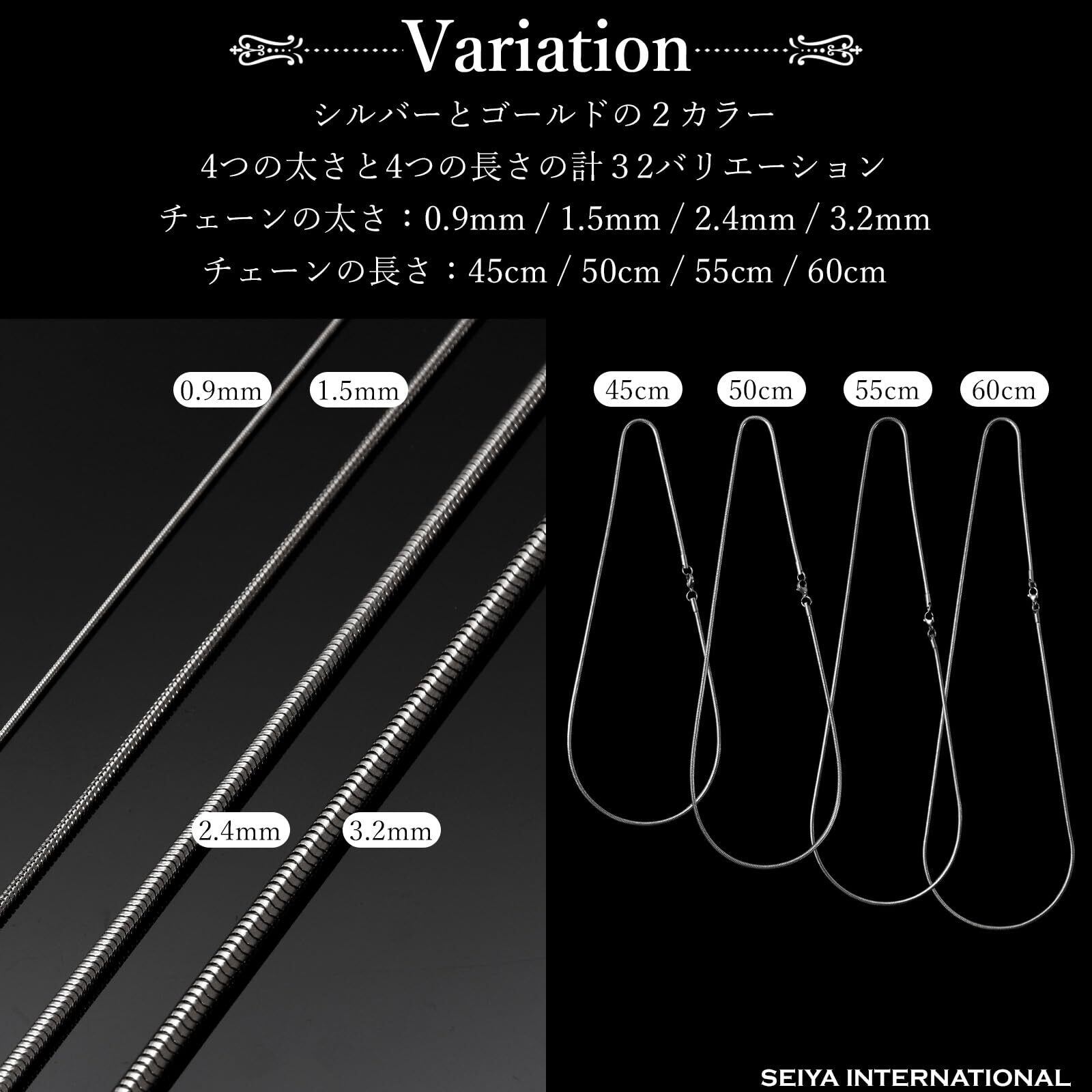 【 人気のスネーク チェーンネックレス 】蛇を連想させる美しい滑らかさ、つるんとした質感と光沢で肌に吸いつくようなしなやかさが特徴のスネーク チェーンネックレスです。どんなファッションにも合わせやすいシンプルさがありながら、程よいボリューム感があるのであなたの首元を華やかにしてくれます。シンプルにチェーンのみでつけたり、お気に入りのペンダントトップをつけるのもおすすめです。【 ネックレス チェーンのみ 】ネックレスチェーンの太さ0.9mm・1.5mm・2.4mm・3.2mm、チェーンの長さ45cm・50cm・55cm・60cmのそれぞれ計32種類ご用意しております。細めのチェーンから存在感がある太めのチェーンと長さを自由に選べるため、きっとあなたのお気に入りの商品が見つかるはずです。このチェーンネックレスで周りと差をつけられること間違いなしです。【 男女兼用のユニセックスデザイン 】きれいめファッション、ストリート系ファッション、韓国ファッション等、様々なファッションジャンルから人気のスネークチェーンネックレス。男性、女性問わずペアでもつけられるおしゃれなネックレスは、プレゼントなど、ギフトにもおすすめなアクセサリーになります。ネックレス メンズ / ネックレス レディース