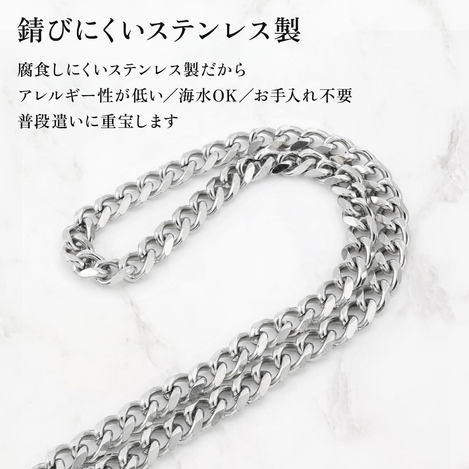 【安心のステンレス製】金属アレルギーを起こしにくい素材と言われているステンレス製のネックレスです。ステンレスはほかにも錆びづらいためお風呂に入る時でもつけっぱなしで大丈夫です。 ※アレルギー症状を起こしにくいステンレスですが、もしお肌に異常が感じられた場合は直ちに着用をやめるようお願いします。