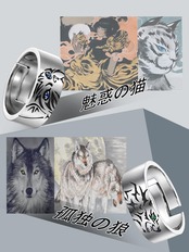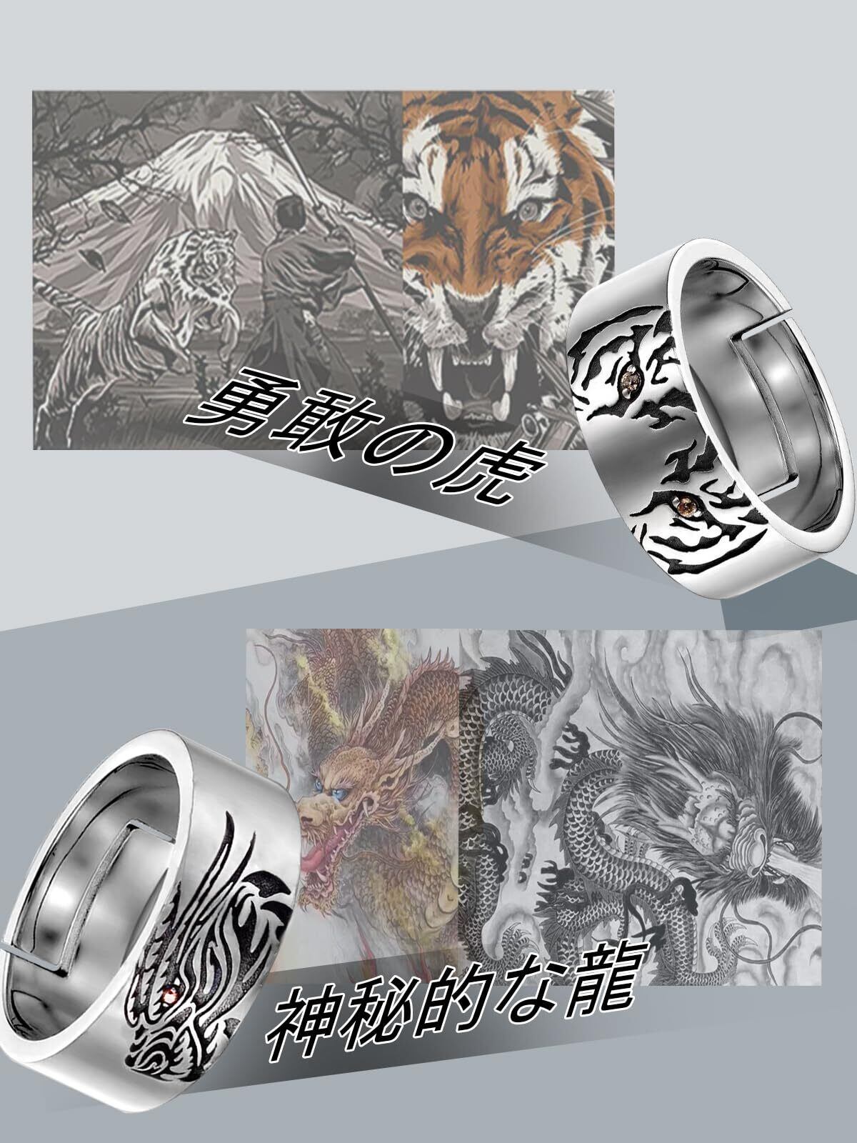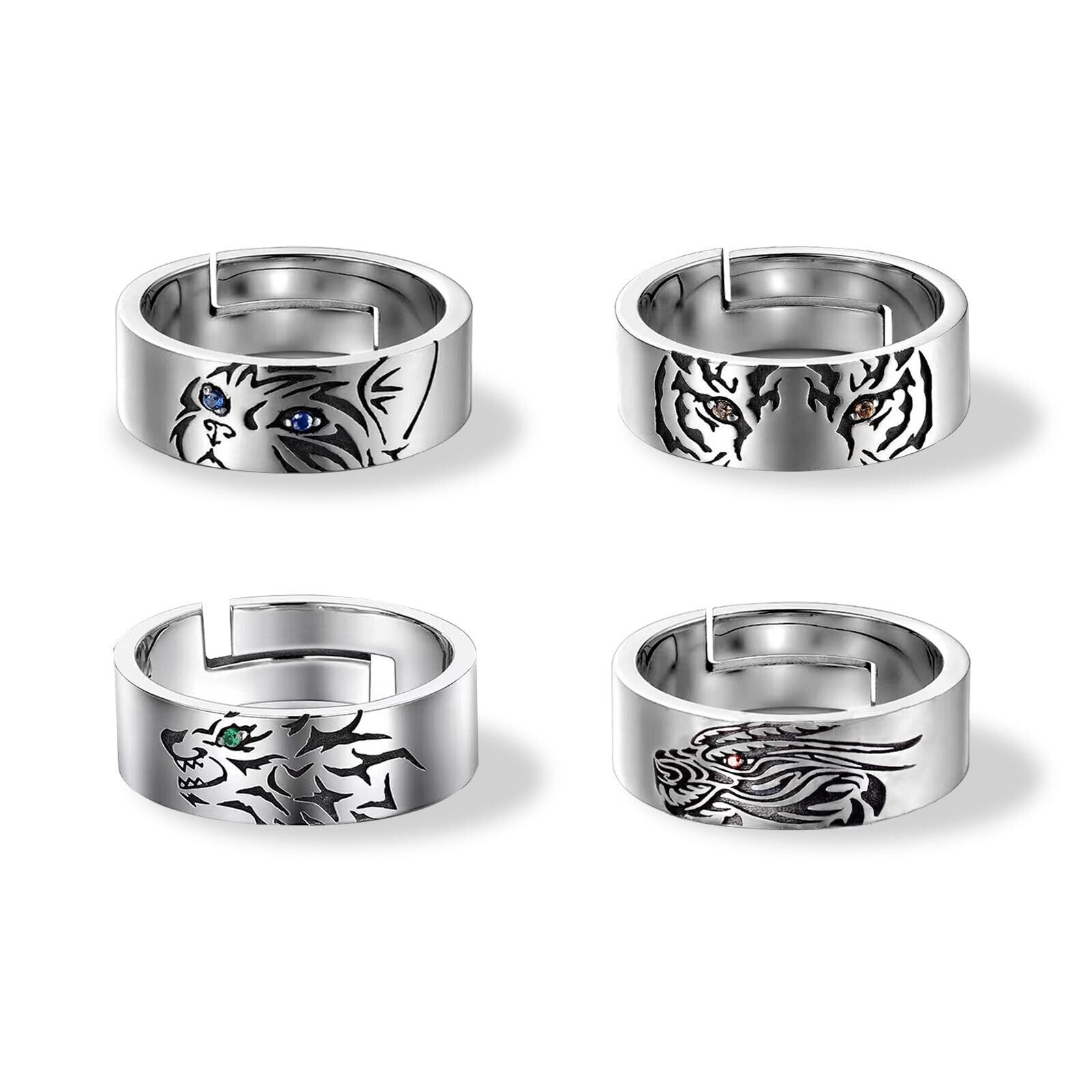【4種類の動物模様指輪セット】猫、狼、龍、虎デザインのシンプルなデザインで、模様はリアルで、目の部分はジルコンをはめ込まれて目を照らしていて、存在感のあるメンズリングです。1セットで4つの指輪を含んで、スタイリッシュでさりげないデザインデザインが指元をさりげなく付けられるメンズ アクセサリーです。普段使いでもフォーマルでも大活躍する、人気のフリーサイズ指輪です。