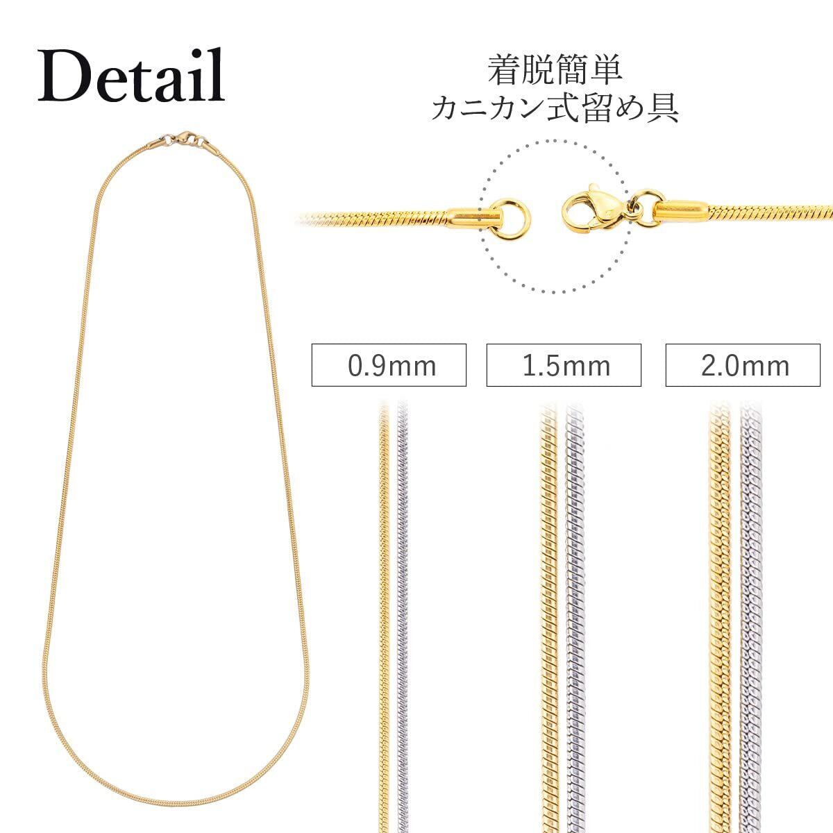 【バリエーション豊富】チェーン幅が0.9mm,1.5mm,2mmの3種類、チェーンの長さが35,cm40cm,45cm,50cm,55cm,60cm,70cm、カラーがシルバー、ゴールド、ピンクゴールドの3色の計50種類からお選びいただけますので貴方のお気に入りがきっと見つかります。シンプルに着用したり、2,3本重ねて着けたりお手持ちのチャームなどと合わせてみたりとお好みのスタイルでお楽しみいただけます。