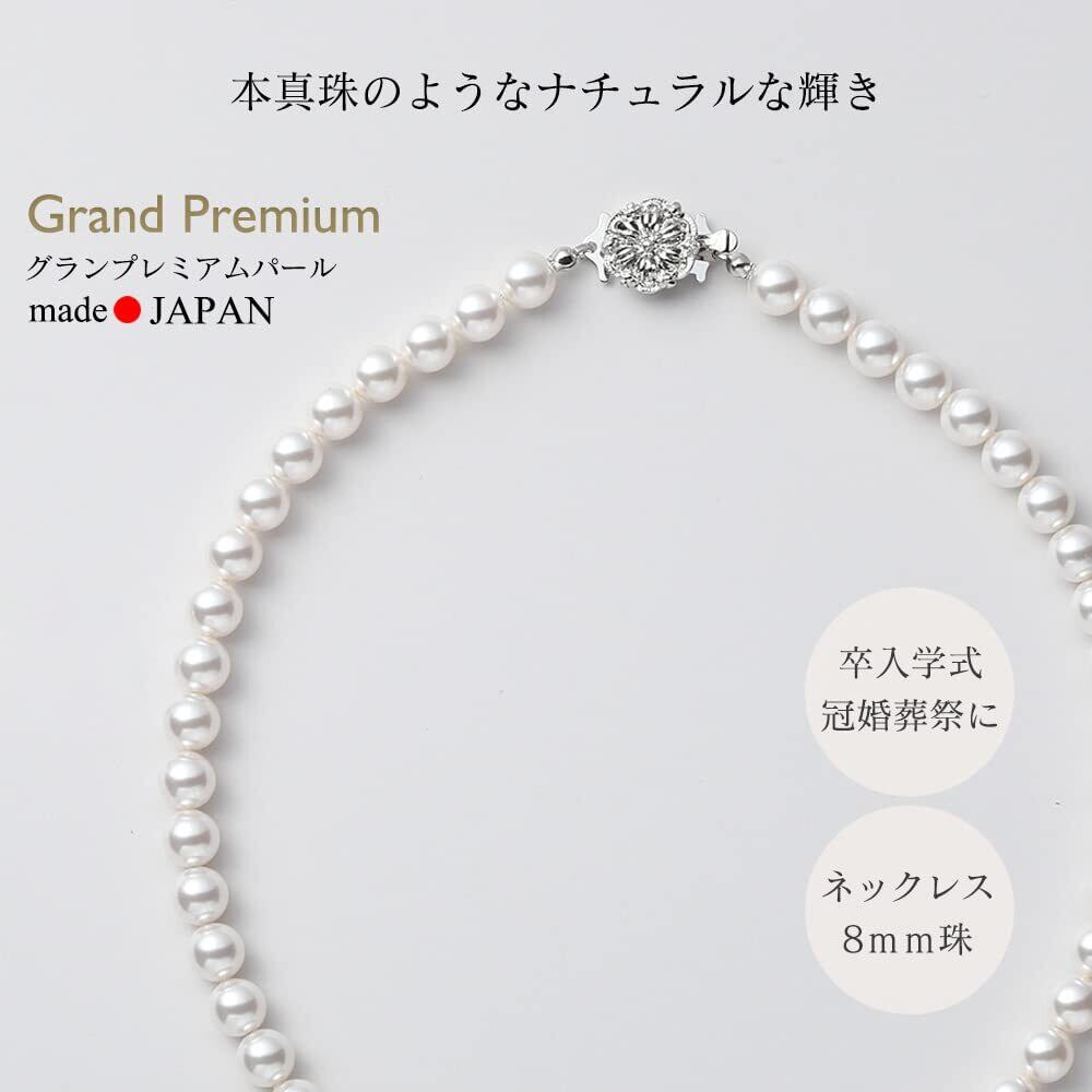 あこや真珠のように美しく輝く真珠のネックレス。クールかつ上品なシルバーの留め具が特徴です。 本真珠のようにナチュラルに輝くグランプレミアムパールの中でも照り・色・キズにこだわり、真円の真珠を使用した高品質なフォーマルネックレス。 国内の自社工房にて職人が丹精込めて製作した美しく真珠が並ぶ高級仕上げです。冠婚葬祭はもちろん、大切な方へのプレゼントにも最適です。