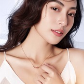 華奢可愛: 繊細に煌くピンクゴールドのネックレスが華やかさと可愛さをプラスして、シンプルなのに上品さを感じさせる優美なインフィニティモチーフ
