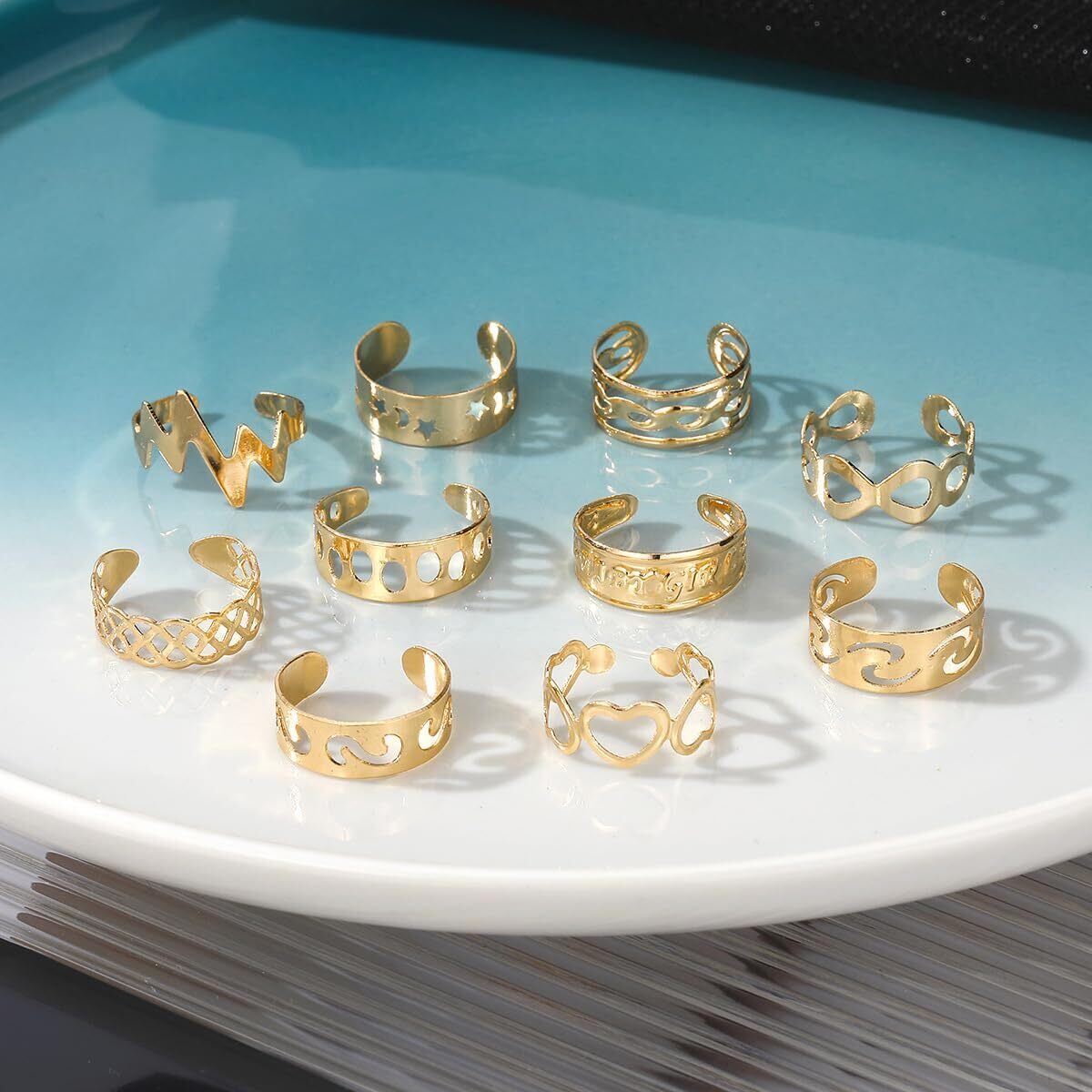 [Rockyu] トゥリング レディース ゴールド シルバー フリーサイズ 波型モチーフ 星形 稲妻風 8字デザイン入り リング 10点セット 合金 軽量 調整可能 ビーチ リゾート向け