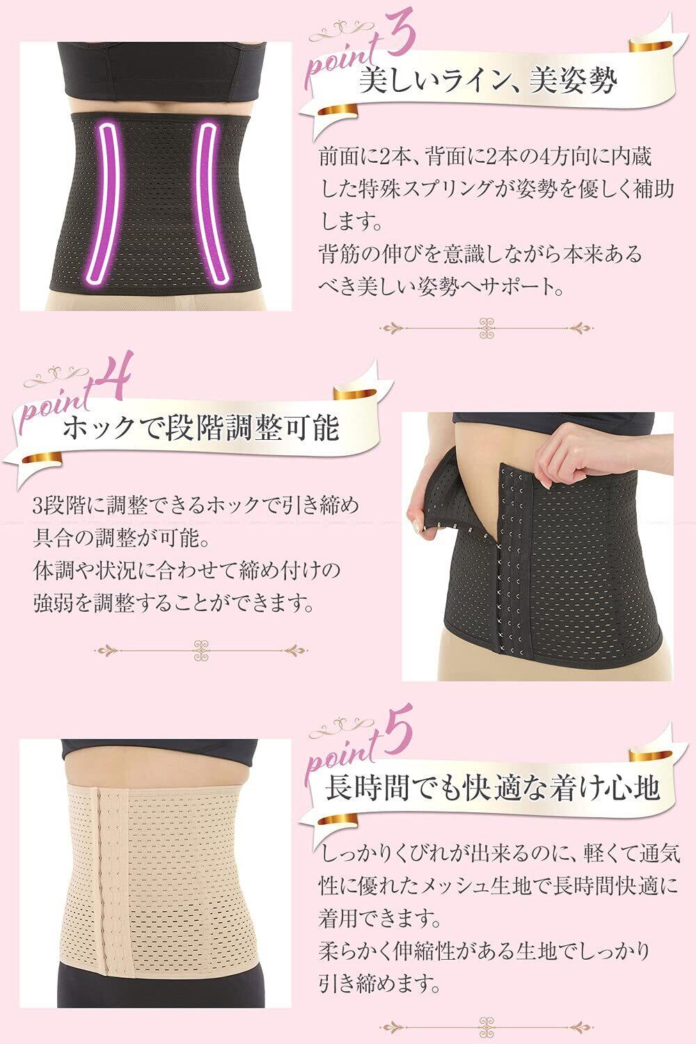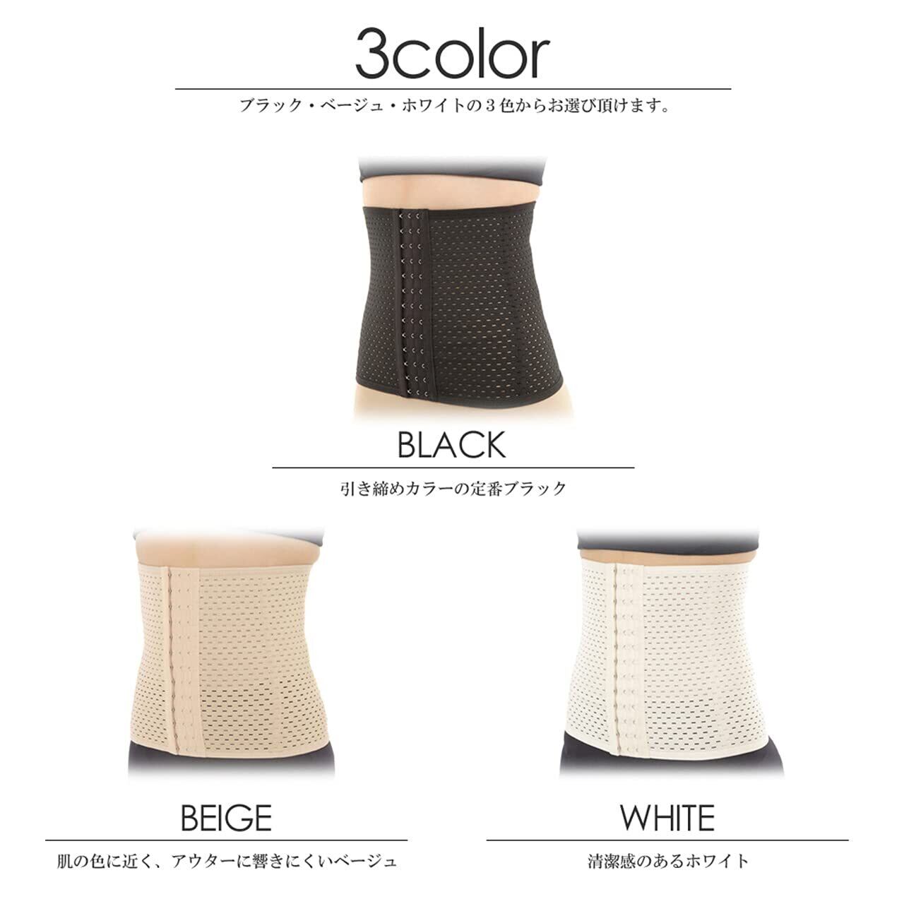 3段階のホックでお好みの締め付け感に調整可能。メッシュ生地で通気性もあり快適な付け心地。腰サポーター、骨盤ベルトとしてもご使用いただけます。