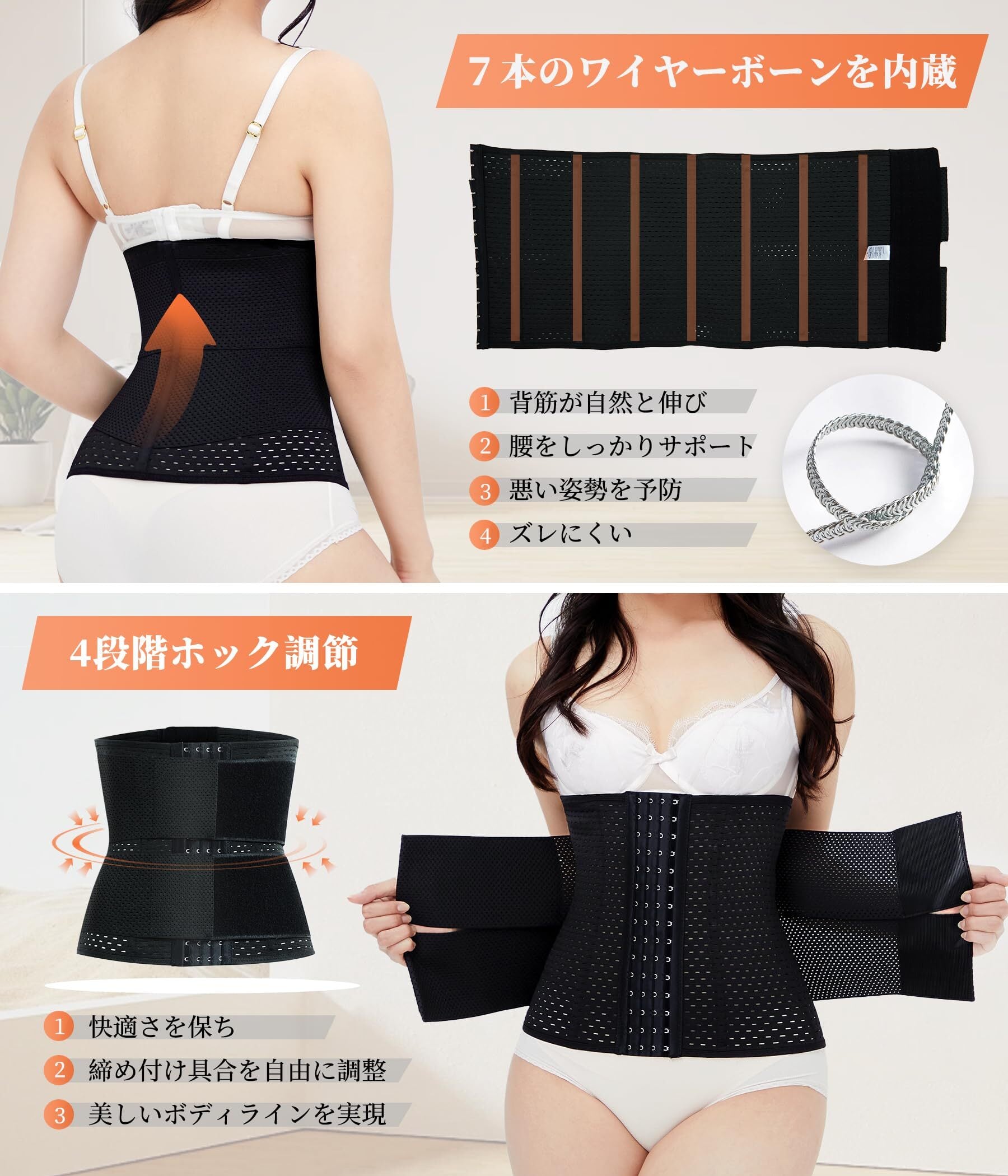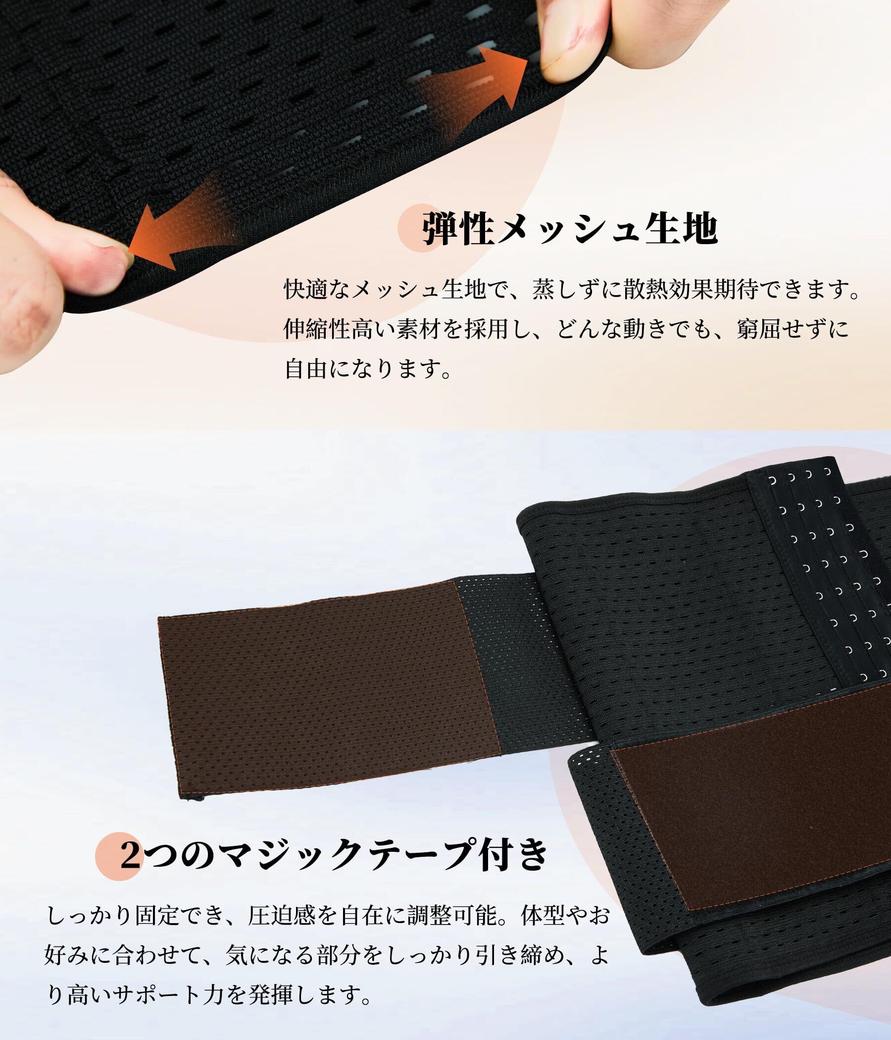 「调节可能」この腰痛 ベルトは、4段階のホックでお好みの締め付け感に調整可能。メッシュ生地で通気性もあり快適な付け心地。腰 サポーター、骨盤ベルトとしてもご使用いただけます。腰周りを包み込み腰痛を緩和されます。