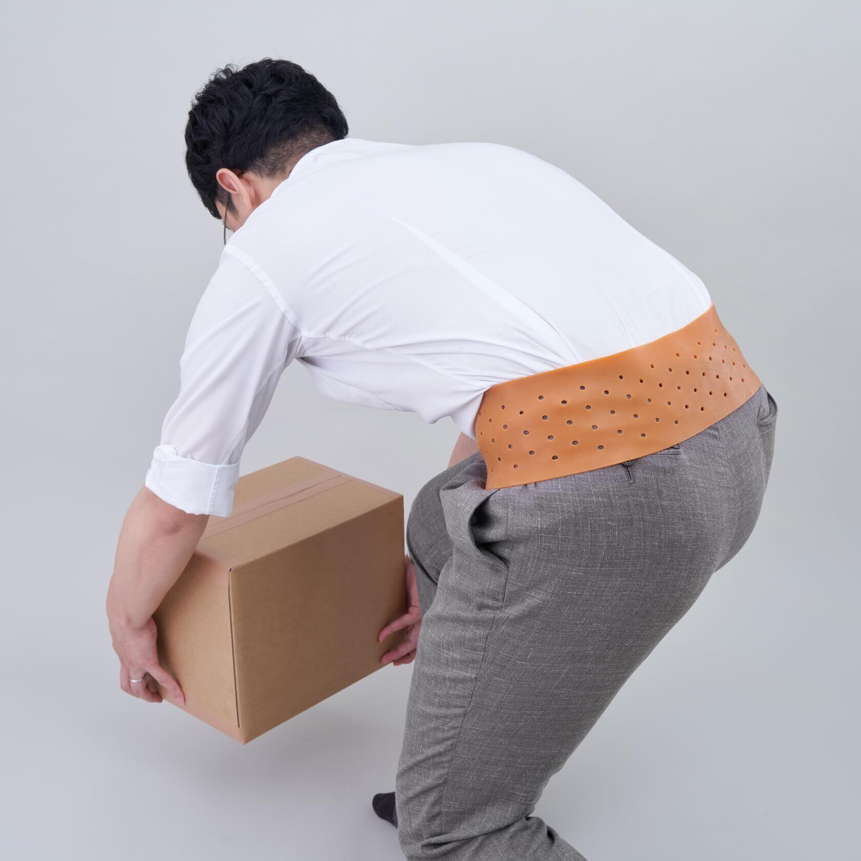 着脱簡単な天然ゴム製の骨盤ベルト。衣類にひびかない薄さ。大きめの面ファスナーで調整がしやすい。通気孔で蒸れにくい。