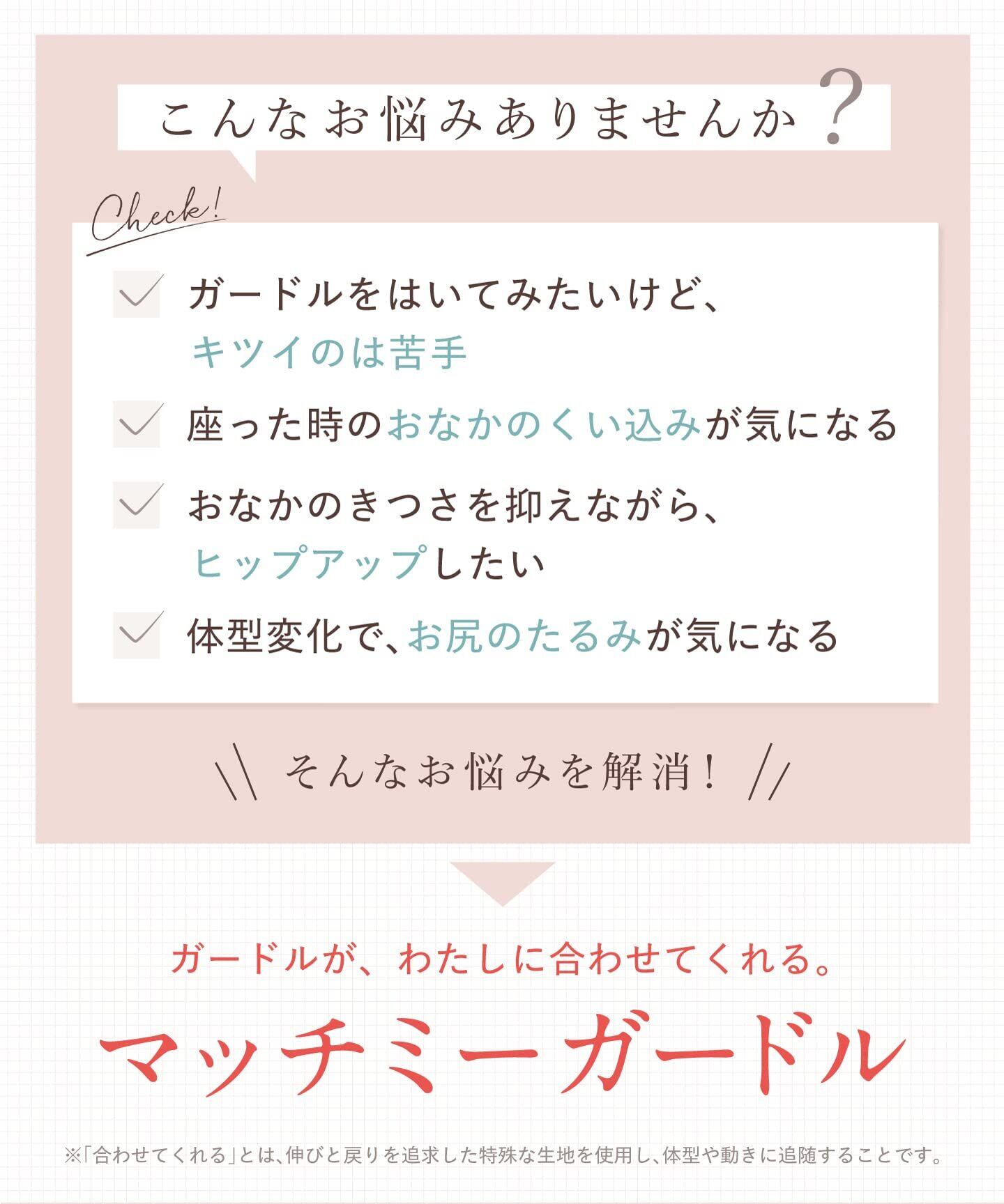 「マッチミーガードル」:タテ・ヨコによく伸びてしっかり戻って「ガードルが、わたしに合わせてくれる」 ※「合わせてくれる」とは、伸びと戻りを追求した特殊な生地を使用し、体型や動きに追随することです。