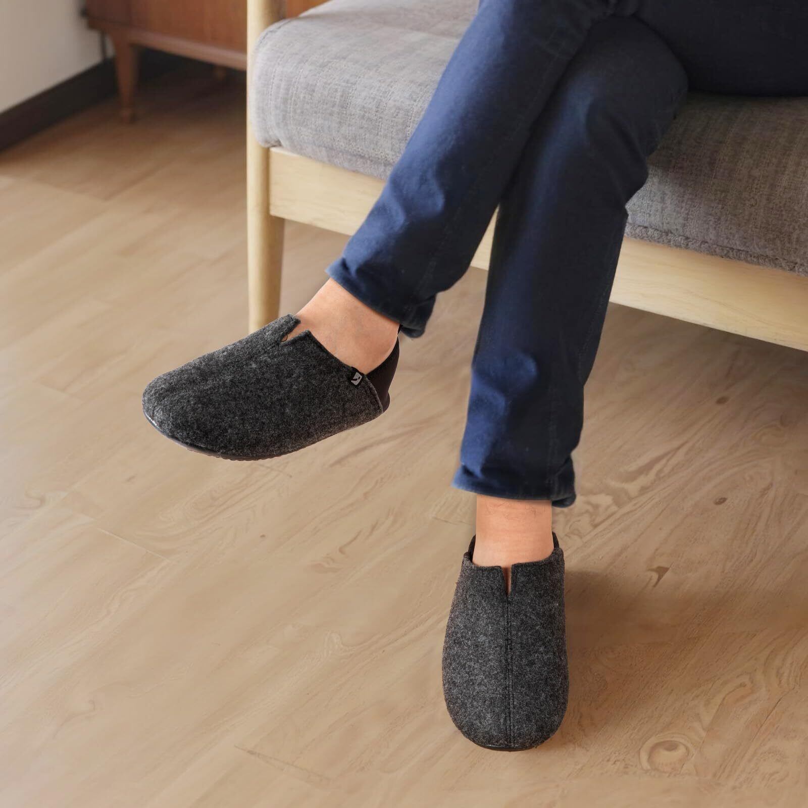 【厳選された素材】ルームシューズのアッパはフェルト素材で作られ、柔らかい肌触りとナチュラルな風合いを味わえます。高い保温性と防風性を兼ね備え、寒い季節にご着用いただけます。