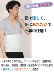 シルクのしなやかさと肌触りのやさしい綿とのコラボレーションにより、吸湿性・通気性・保温性のバランスがとれた「夏は涼しく、冬はあたたかい」一年中あたたかさをキープする薄手でもあたたかい【シルクinコットン腹巻】