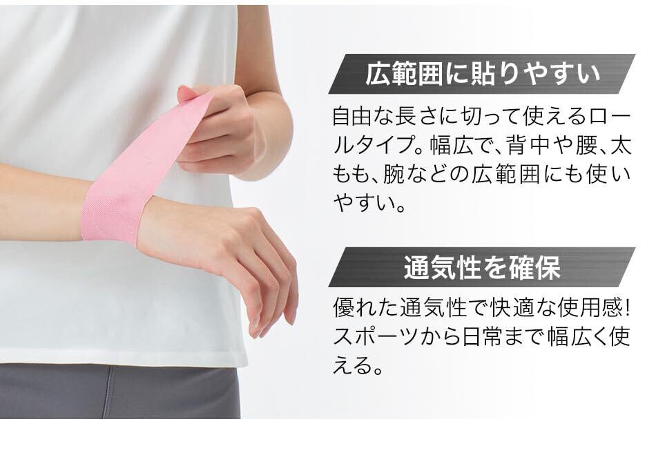 優れた伸縮性で様々な動きにフィットし、関節部にも貼りやすくはがれにくい。幅広で背中や腰、太もも、腕などの広範囲にも使いやすい。通気性、撥水性に優れスポーツシーンに最適。