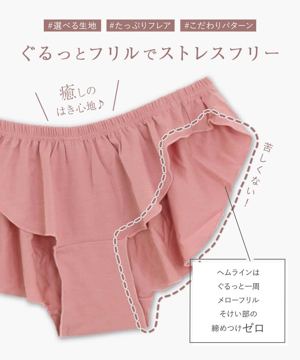 ◆【鼠径部&リンパ開放で楽ちん! 食い込まないふんどしパンツ】無駄な装飾を省き、鼠径部のゴムを無くしたシンプルな無地ショーツ。ふんわり広がる裾のヘムラインにメローフリルをぐるっと一周施し、ひだが揺れてロマンティックな印象たっぷり生地が揺れるフレアの可愛さと、快適な着心地を両立しました!