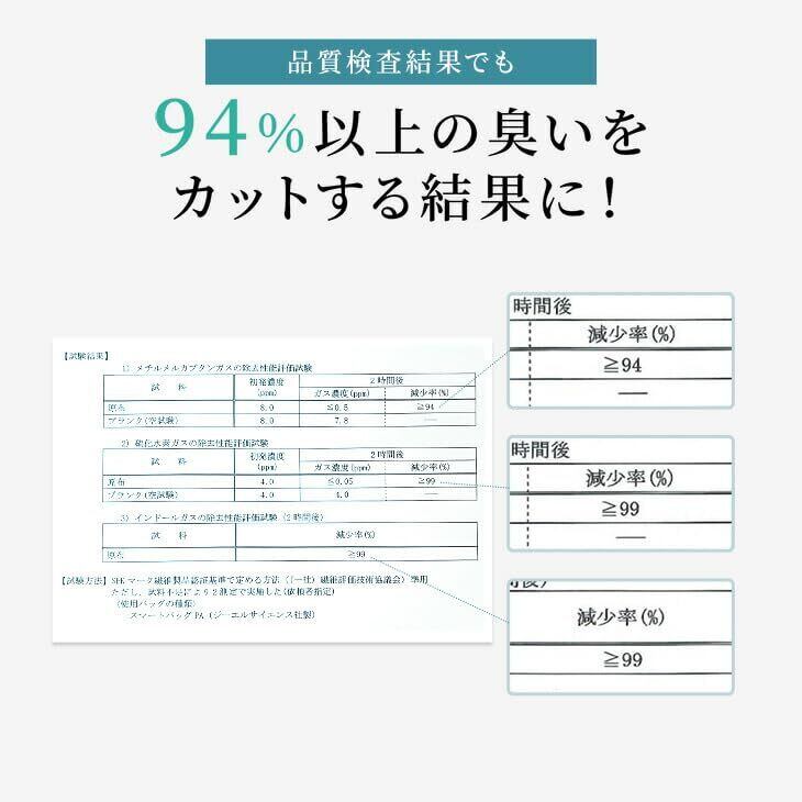強力活性炭でおならなどの気になる臭いを94%以上カット (カケンテストセンターで消臭テスト実施済み)