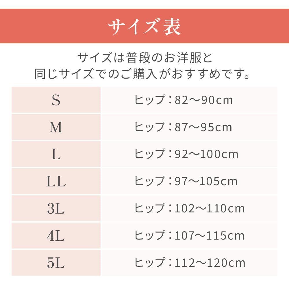【サイズ選び】Sサイズ82~90㎝、Mサイズ87-95㎝、Lサイズ92-100㎝、LLサイズ97-105㎝、3Lサイズ102-110㎝、4Lサイズ107~115cm、5Lサイズ112~120cm ※いずれもヒップサイズ