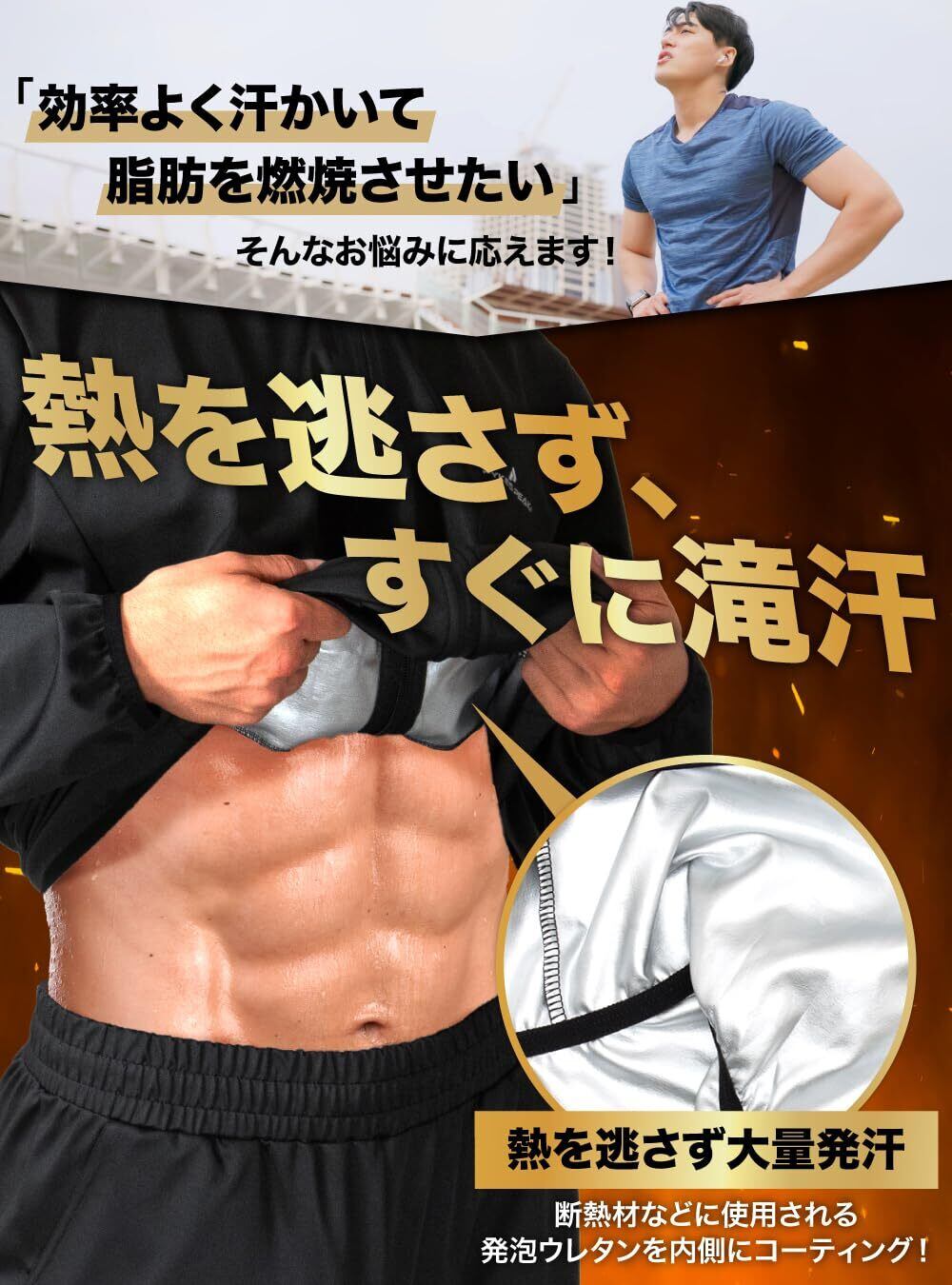 【熱を逃さず、すぐに滝汗!】「効率よく汗かいて脂肪を燃焼させたい。」そんなお悩みに応えます!PYKES PEAKのサウナスーツは、断熱材などに使用されるポリウレタンを内側にコーティングしているため、身体から熱を逃さず、大量発汗することができます。短時間で有酸素運動の効果を促進します。
