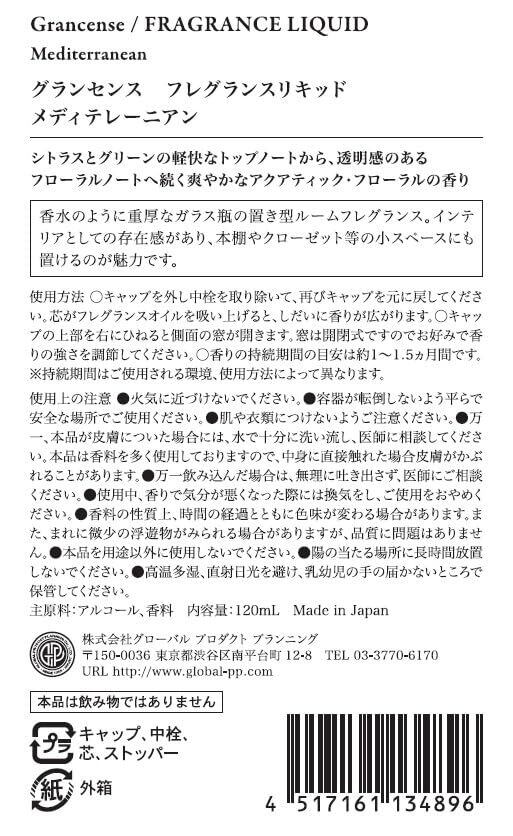 【在庫セール】グランセンス(Grancense) グランセンス フレグランスリキッド(約1~1.5ヶ月) メディテレーニアン 120ml(室内用芳香剤 ルームフレグランス タッセル付 潮風を感じさせてくれるアクアティック・フローラルの香り)