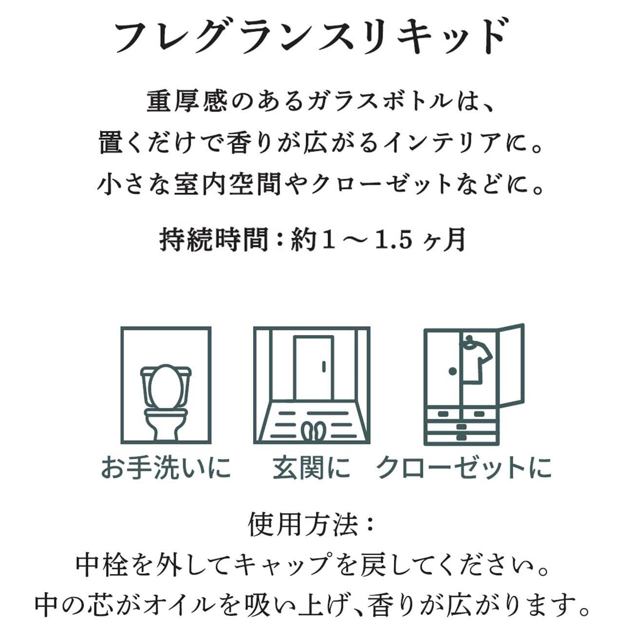 香水のような重厚感のあるガラスボトルは、インテリアとしての存在感もありながら置くだけで香りが広がる手軽さが魅力のアイテムです。