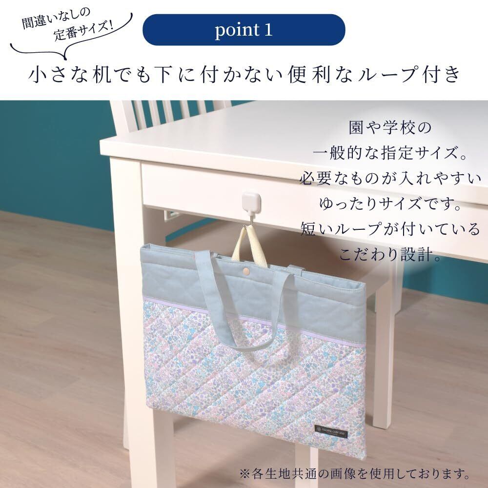 小学校・幼稚園・保育園からの一般的な指定サイズ30×40cm、スナップボタン&ネームタグ付き。大判の絵本やスケッチブックなどがすっぽり入る定番サイズ。名札を付けるDカンも付属しています。<br>袋口のスナップボタンを留めることで、中身が飛び出しにくく安心。プライバシーに配慮し、ネームタグは内側に付いております。