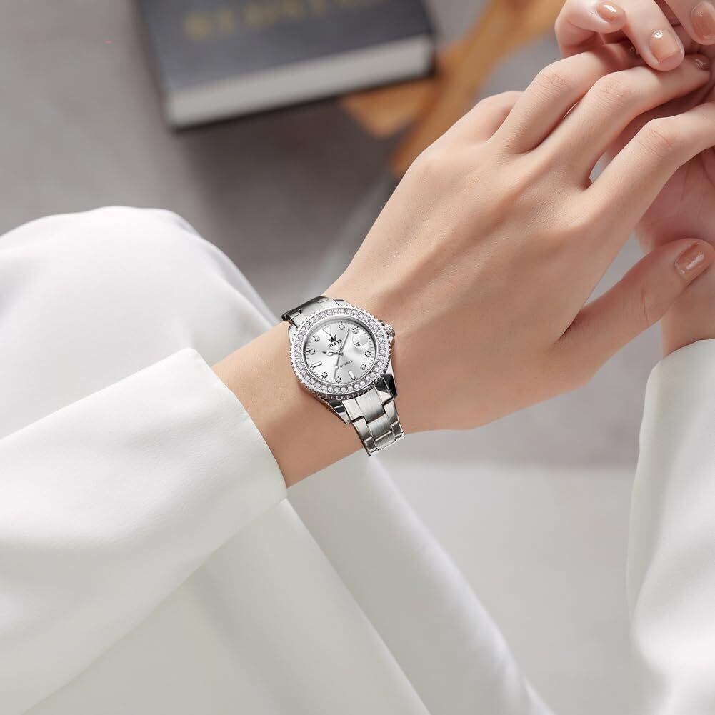 OLEVS女性腕時計:高級感溢れるデザインで、ダイヤモンド文字盤がエレガントなスタイルを呈しています。時計は夜光機能を備えているため、夜でも時間を確認できます。