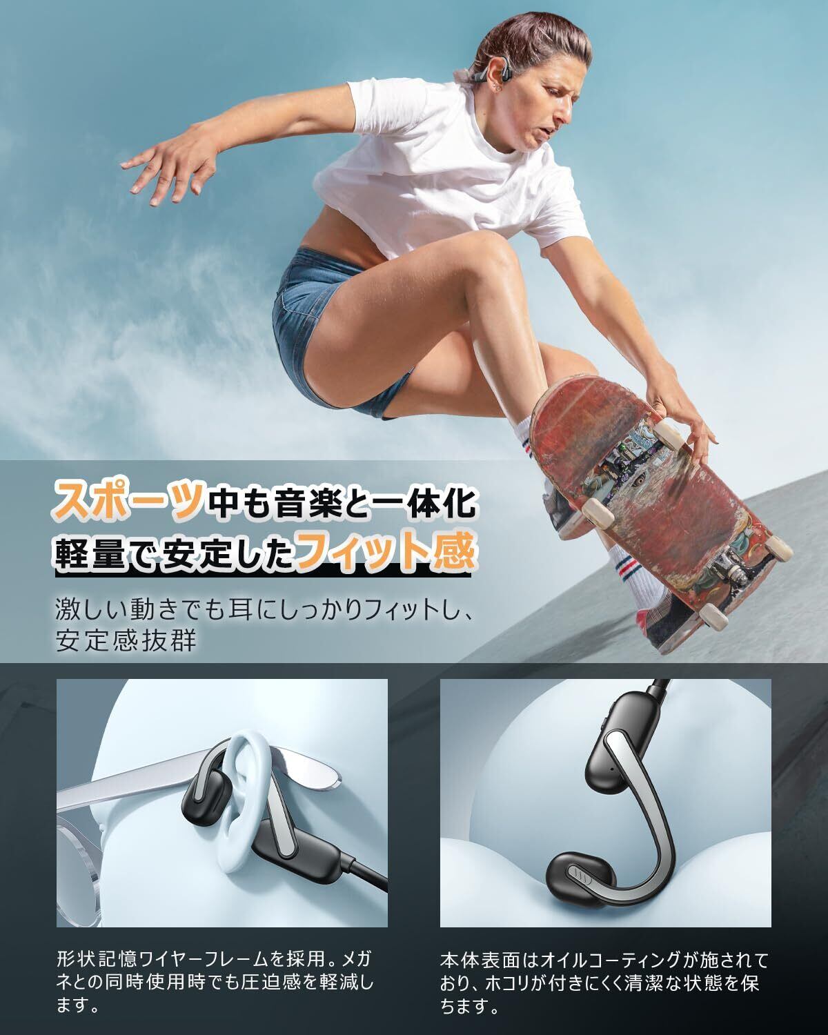 【開放型骨伝導・耳を塞がず&超軽量デザイン】の骨伝導イヤホンは、鼓膜ではなく骨を振動させて音を聴覚神経に伝える新しいタイプのイヤホンです。これにより、耳を塞ぐことなく音楽を楽しむことができ、長時間使用しても耳が痛くなることなく快適に過ごせます。特に、ランニングや筋トレ、家事、テレワークなど、動きながら音楽を楽しむ「ながら使い」に最適です。耳をふさがずに、周囲の音(車の音や信号音など)をしっかりと聞き取ることができるため、特に安全性が求められるシチュエーションでも安心して使用できます。例えば、ジョギング中でも、周囲の音に気を配りながら音楽を楽しむことができます。さらに、業界初の30gという超軽量設計で、イヤホンを付けていることを忘れてしまうほどの極上のフィット感を提供します。軽量でクリアな音質、そして聴き疲れしにくい特長は、長時間の使用でも快適さを保つため、どんなシーンでも楽しめます。