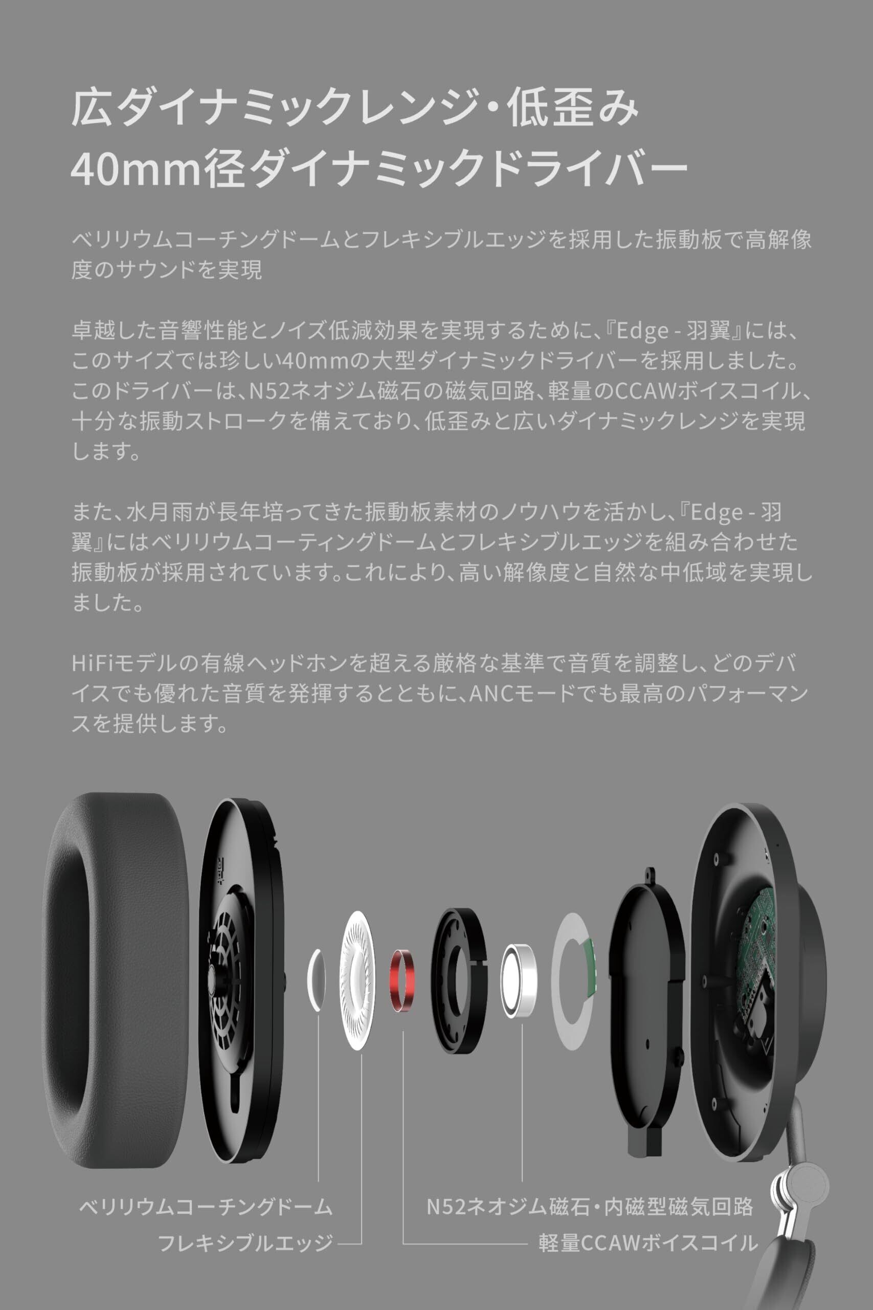 【ANC対応HiFi音質 & ワイヤレスポータブルヘッドホン】『Edge - 羽翼』には、このサイズのヘッドホンでは珍しい40mmの大型ダイナミックドライバーを搭載しています。このドライバーは、N52ネオジム磁石を使用した磁気回路、軽量なCCAWボイスコイル、そして十分な振動ストロークを備え、低歪みと広いダイナミックレンジを実現します。さらに、HiFi規格に準拠した有線ヘッドホンに匹敵する、厳格な音質基準で調整されています。どのデバイスでも優れた音質を提供し、アクティブノイズキャンセリング(ANC)モードでも最高のパフォーマンスを発揮します。