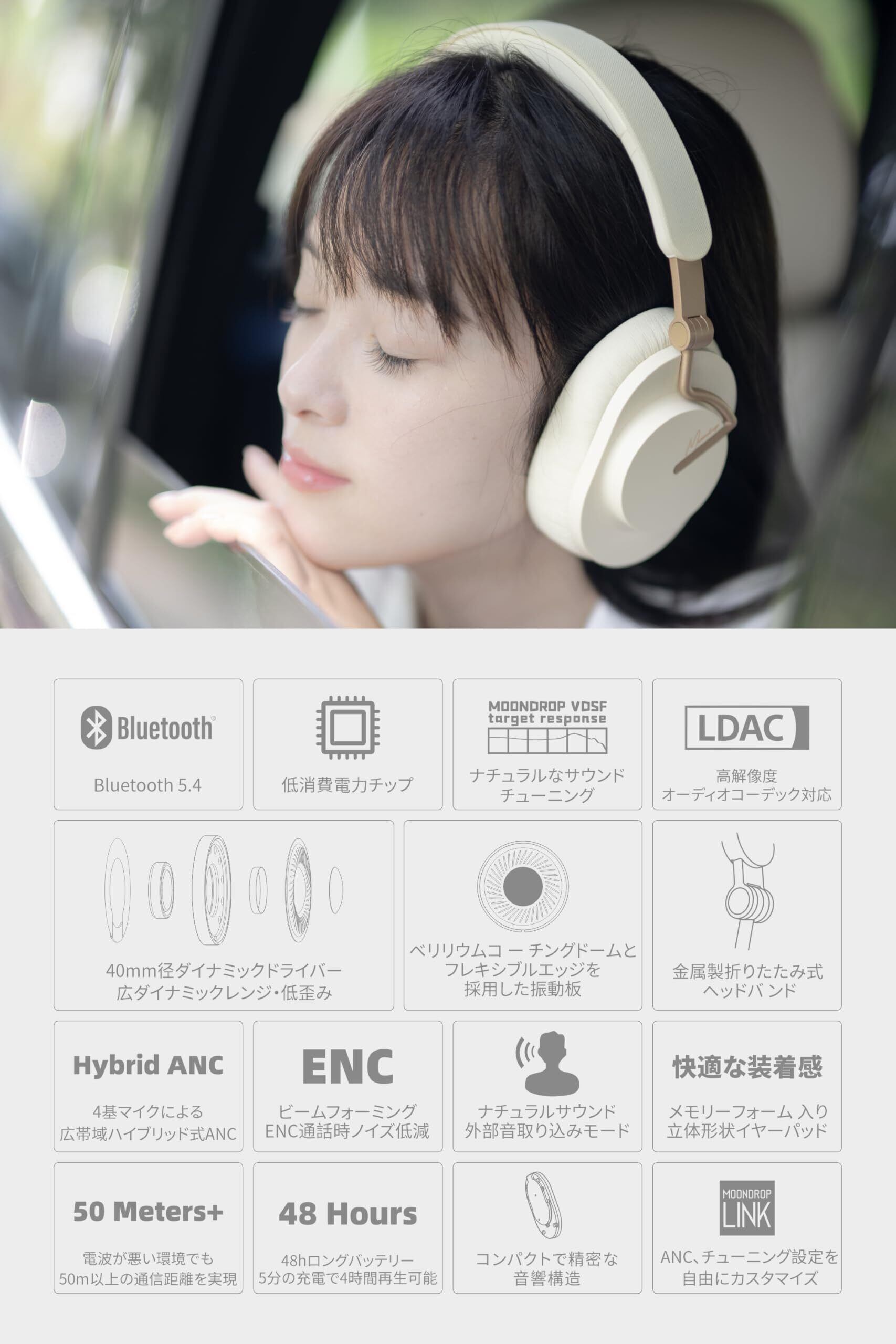 【アルミ合金製折りたたみ式構造のヘッドバンド & 5種類のチューニング】ヘッドバンドのスイーベル部分にはアルミ合金を使用し、精密な調整と仕上げ加工を施すことで、高い質感とデザイン性を実現しました。特別に設計された折りたたみ構造により、持ち運びやすさと利便性が向上しています。5種類のサウンドチューニングを搭載しており、デフォルト設定に加え、名機のサウンドを再現したチューニングも含まれています。MOONDROPアプリを使用すれば、簡単に切り替えられ、多彩な音楽ジャンルをお楽しみいただけます。