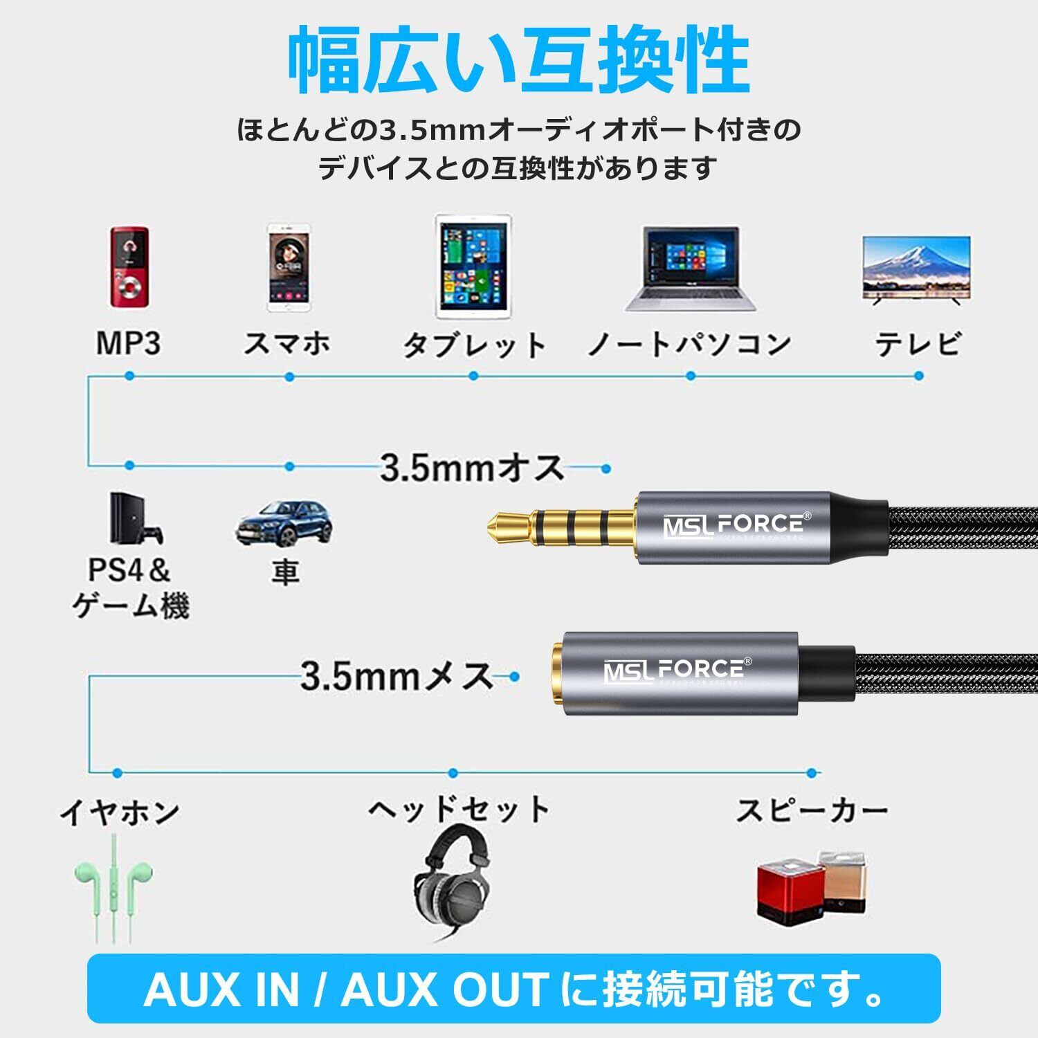 【4極 3.5mm オーディオケーブル】3.5mm オーディオケーブルは、ヘッドホン、イヤホン、スピーカー及び全ての標準3.5mmステレオミニプラグを搭載した車載 AUXポートに対応する標準3.5mmステレオミニプラグ(オス-メス)付き、カーステレオ、iPhone/Androidスマホ、パソコン、ゲーム機など機器の音源と再生機器の間の距離が遠い場合やにイヤホン・ヘッドホンケーブルとして接続可能です。