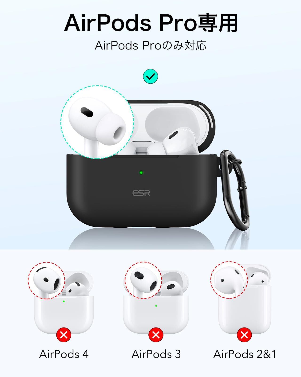 【互換性】:AirPods Pro第2世代(2023/2022)(USB-C/Lightningケーブル)およびAirPods Pro第1世代(2019)のみ対応。イヤホンと充電ケースは付属していません。